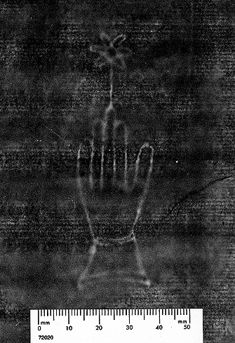 DATE: [1492] WATERMARK INFORMATION: PRIMARY: Hand (IPH KEY: A7.2) DIMENSIONS: 88 mm high x 28 mm wide SECONDARY: 6-rayed star; glove PROCESS: Betradiography SIDE: Mold TWIN: HND.105.1 ![]() PAPER INFORMATION: PAPER SIZE: 253 x 187 (trimmed) mm MANUFACTURE: Laid CHAINS: 39-52.5-39 (attendant) ARTIFACT INFORMATION: ARTIFACT: Richard Pynson's [1492] edition of the Canterbury Tales AUTHOR: Chaucer, Geoffrey YEAR OF USE: 1492 (inferred) London, England REPOSITORY: The Newberry Library SHELFMARK: Inc. 9780 PAGE: 34 recto/sig. [e6] DATABASE INFORMATION: RECORD ADDED: 28 February 2001 NO. 2193 GENERAL COMMENTS: Richard Pynson's [1492] edition of the Canterbury Tales. An unbound fragment of 77 folios.Courtesy the Newberry Library, Chicago. No further reproduction or distribution without express written permission is allowed. Individuals may download a copy for private study or teaching purposes. |