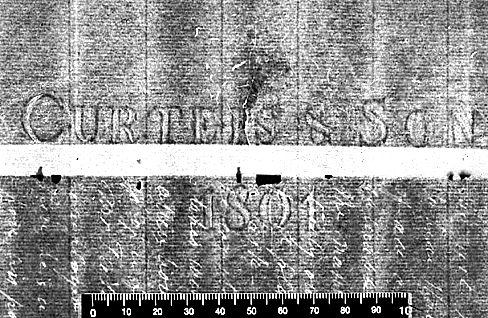 DATE: January 31, 1807 WATERMARK INFORMATION: PRIMARY: NamesWords (IPH KEY: Y) DIMENSIONS: 43 mm high x 143 mm wide SECONDARY: "CURTEIS & SON | 1801" PROCESS: DYLUX PAPER INFORMATION: MANUFACTURE: Laid CHAINS: 24-24-24-23.5-24 PAPERMILL: Carshalton Mills PAPERMAKER: Curteis & Son(s) LOCATION: Surrey, England ARTIFACT INFORMATION: ARTIFACT: Letter YEAR OF USE: 1807 Charlottesville, Virginia, United States REPOSITORY: Library of Congress SHELFMARK: Box 59, #28911-28912 DATABASE INFORMATION: RECORD ADDED: 12 November 2004 NO. 3075 GENERAL COMMENTS: Thomas Jefferson, General Correspondence. NOTE ON THE PAPER: “1787. A watermark CURTEIS & SONS is in Churchill, No. 231. (See Watermark No. 32 in this book.)....In 1789 the paper mill was insured by William, John and Thomas Curteis, paper makers....In 1794 William, John and Thomas Curteis, paper makers, insured the drying lofts etc....By [1800] the leading member of the firm wwas almost certainly Thomas Curteis, who was a master paper maker in 1796....The mill was in his hands after 1800. In 1804 Thomas Curteis, paper maker, insured the drying lofts etc. (Shorter 1957, pp. 236-7). REFERENCES: Shorter, Alfred H.. Paper Mills and Paper Makers in England, 1495-1800. Hilversum, 1957. |