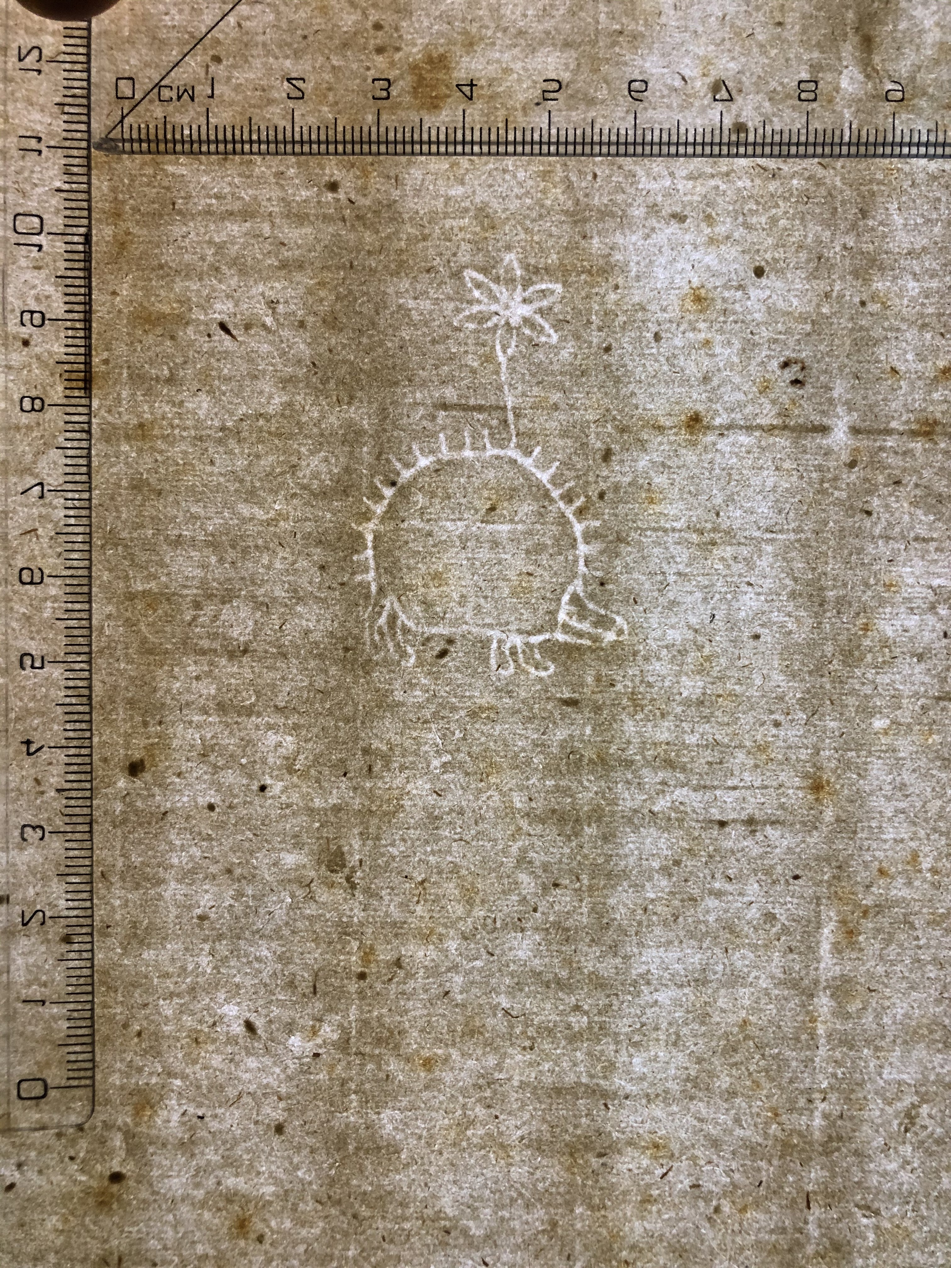 Identifier: 157_II Description: hedgehog, six-leaf flower Height: 49 Width: 32 Chain line distance: 28 No. chain lines in sheet: 14+2 Distance side wire-chain line: 18 Depository: Státní okresní archiv (SOkA) Jihlava Shelfmark: AMJ do 1848, ÚKaR, inv.n. 337 Source: Czech Copybook Dating: 1576 Sheet dimension (cm): 31x42
