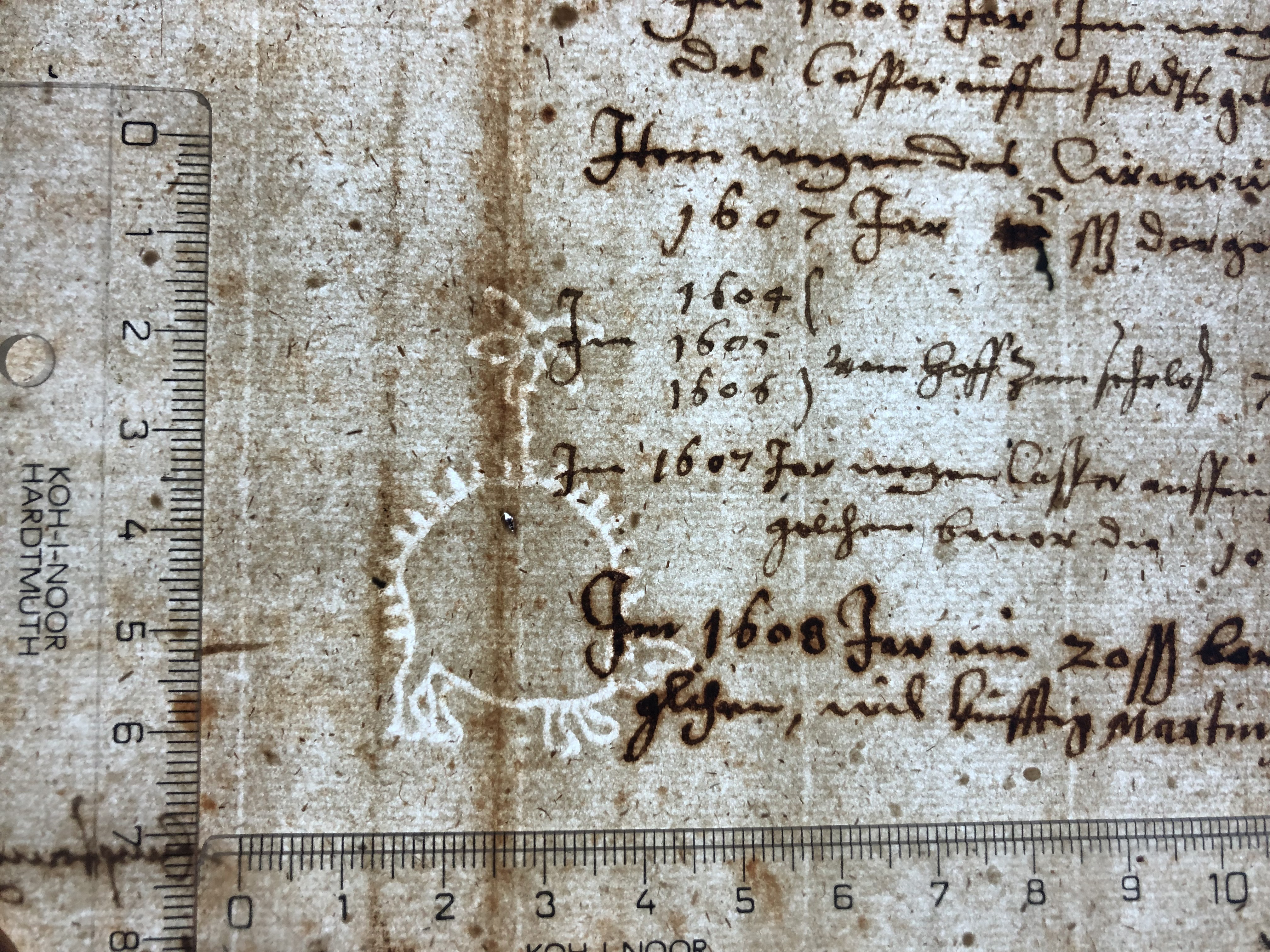 Identifier: 212 Description: hedgehog, six-leaf flower Height: 49 Width: 32 Chain line distance: 28 No. chain lines in sheet: 14+2 Distance side wire-chain line: 16 Depository: Státní okresní archiv (SOkA) Jihlava Shelfmark: AMJ do 1848, VÚ, inv.n. 89 Dating: 1604 Paper mill: Staré Hory, Jihlava Paper maker: Pavel Frey Placement: a Sheet dimension (cm): 30x40