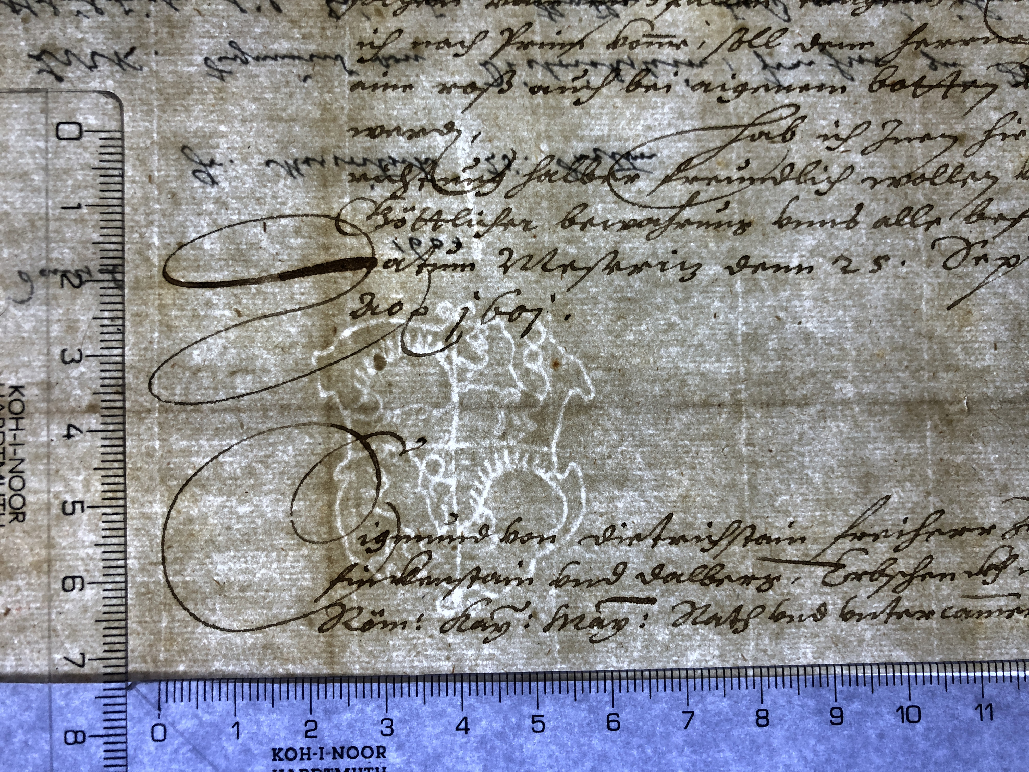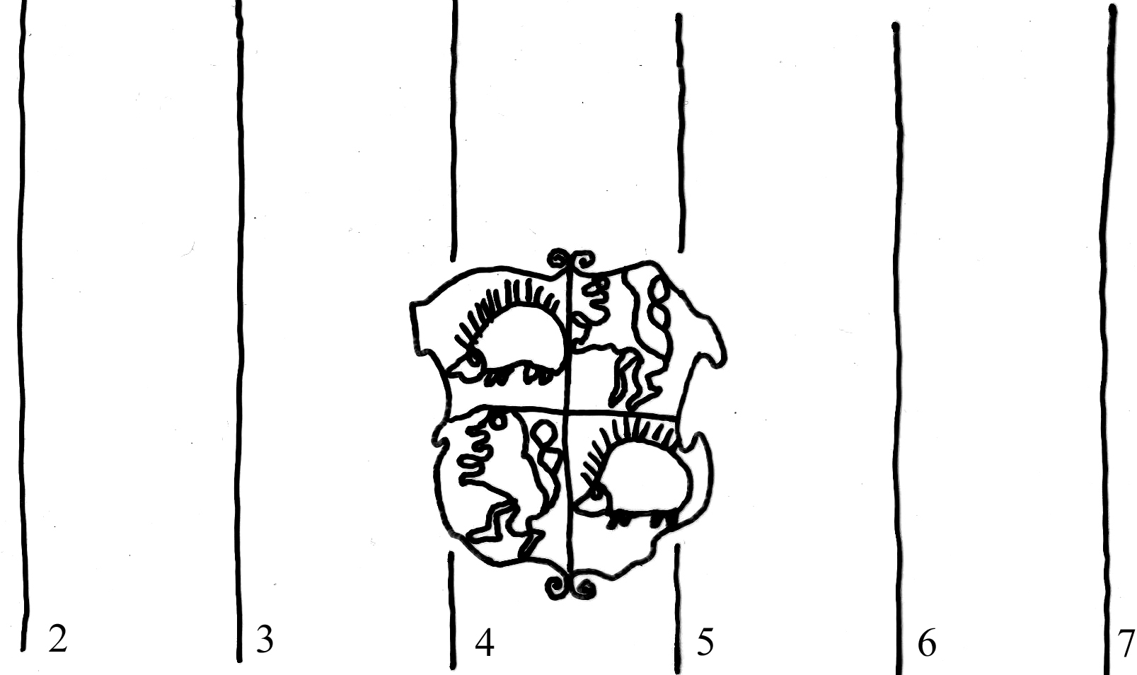 Identifier: 230 Description: coat of arms, hedgehogs and bohemian lion Height: 43 Width: 39 Chain line distance: 26 No. chain lines in sheet: 8*+1* Distance side wire-chain line: 19 Depository: Státní okresní archiv (SOkA) Jihlava Shelfmark: AMJ do 1848, SR, I3, 1601 Dating: 1601 Paper mill: Staré Hory, Jihlava Paper maker: Pavel Frey Placement: a Sheet dimension (cm): 19x21