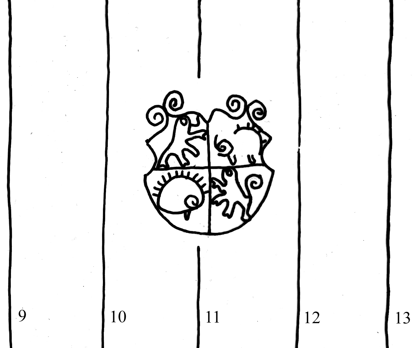 Identifier: 243 Description: coat of arms, hedgehogs and bohemian lion Height: 41 Width: 37 Chain line distance: 26 No. chain lines in sheet: 15+2 Distance side wire-chain line: 16 Depository: Státní okresní archiv (SOkA) Jihlava Shelfmark: AMJ do 1848, SR, I4, 1585 Dating: 1585 Paper mill: Staré Hory, Jihlava Paper maker: Benedikt Frey Placement: a Sheet dimension (cm): 30x42,5