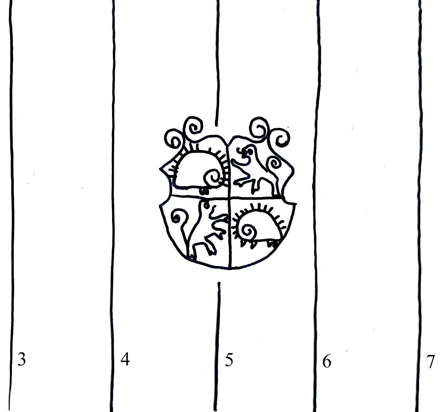 Identifier: 255 Description: coat of arms, hedgehogs and bohemian lion Height: 42 Width: 36 Chain line distance: 26 No. chain lines in sheet: 8*+1* Distance side wire-chain line: 16 Depository: Státní okresní archiv (SOkA) Jihlava Shelfmark: AMJ do 1848, SR, I7, 1584 Dating: 1584 Paper mill: Staré Hory, Jihlava Paper maker: Benedikt Frey Placement: a Sheet dimension (cm): 30x21,5