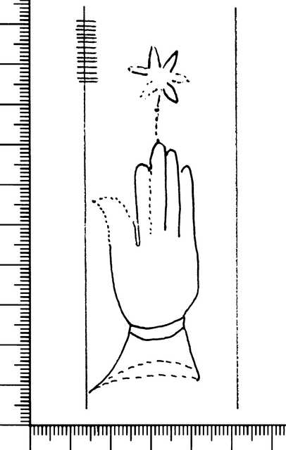 Tipo de filigrana: Sencilla Parte estudiada: Toda la filigrana Código del Motivo: B.02.02.03 Descripción: Mano con cuatro dedos juntos y el pulgar separado Encima flor de seis puntas Estructura: Tradicional de líneas Altura (mm): 86 Anchura (mm): 30 Tipo de papel: Verjurado Posición en la hoja: Medio centro Nº de corondeles en la hoja: 6 Distancia entre corondeles: 3-37-39-(38)-39-39-25 Situada entre el corondel 3 y el corondel 4 Posición en relación al texto: Perpendicular al texto hacia abajo Origen de los datos: Datos obtenidos del original Información adicional: Son visibles las puntadas que unen la filigrana a la verjura. Se ven muy mal los corondeles y la filigrana. Autor de los datos de este registro: María Dolores Díaz de Miranda Macías Tipo de uso: Papel para escribir Estado de la hoja: Cortado borde derecho e izquierdo Altura de la hoja: 310 Anchura de la hoja: 220 Color de la hoja: Natural Estado de conservación: Bueno pH del papel: 6,70 Indicador de pH: Por electrodo de contacto Institución: Archivo del Monasterio de San Pelayo