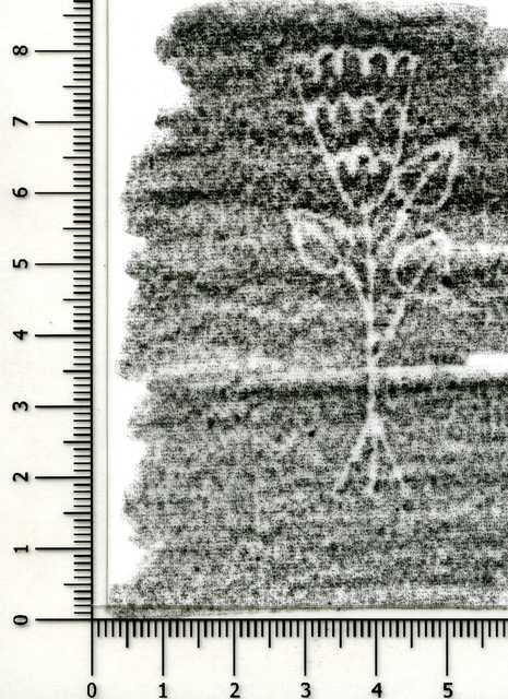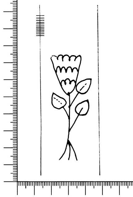 Tipo de filigrana: Sencilla Parte estudiada: Toda la filigrana Código del Motivo: G.03.02.02 Descripción: Flor con tallo en forma de cáliz y tres hojas Estructura: Tradicional de líneas Altura (mm): 63 Anchura (mm): 24 Tipo de papel: Verjurado Posición en la hoja: Izquierda centro Nº de corondeles en la hoja: 13 Distancia entre corondeles: 10-19-38-35-(35)-37-35-35-35-36-35-34-35-19 Situada entre el corondel 4 y el corondel 5 Posición en relación al texto: Perpendicular al texto hacia arriba Origen de los datos: Datos obtenidos del original Información adicional: Son visibles las puntadas que unen la filigrana a la verjura. Otros folios o signaturas del documento donde aparece la filigrana: Filigranas idénticas: Folios 146 y 199 de este mismo libro. Autor de los datos de este registro: María Dolores Díaz de Miranda Macías Tipo de uso: Papel para escribir Estado de la hoja: Cortados todos los bordes Altura de la hoja: 282 Anchura de la hoja: 438 Color de la hoja: Natural Estado de conservación: Regular Información adicional: Altura de la hoja está tomada de la fil. 000283, ya que la hoja esta cortada torcida, entre el borde interno de la hoja y el exerno hay una diferencia de 6 mmm. (280-286 mm) Institución: Archivo del Monasterio de San Pelayo