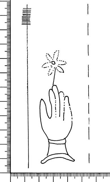 Tipo de filigrana: Sencilla Parte estudiada: Toda la filigrana Código del Motivo: B.02.02.03 Descripción: Mano con cuatro dedos juntos y el pulgar separado Encima flor de seis puntas Estructura: Tradicional de líneas Altura (mm): 80 Anchura (mm): 23 Tipo de papel: Verjurado Posición en la hoja: Medio centro Nº de corondeles en la hoja: 7 Distancia entre corondeles: 19-21-33-(44)-28-28-21-16 Situada entre el corondel 3 y el corondel 4 Posición en relación al texto: Perpendicular al texto hacia arriba Origen de los datos: Datos obtenidos del original Información adicional: Los corondeles a la derecha de la filigrana se ven muy mal. La distancia que hemos puesto entre ellos no es totalmente segura. La filigrana también se ve muy mal. Autor de los datos de este registro: María Dolores Díaz de Miranda Macías Tipo de uso: Papel para escribir Estado de la hoja: Cortado borde izquierdo Altura de la hoja: 295 Anchura de la hoja: 210 Color de la hoja: Natural Estado de conservación: Malo pH del papel: 6,11-6,25 Indicador de pH: Por electrodo de contacto Institución: Archivo del Monasterio de San Pelayo