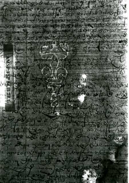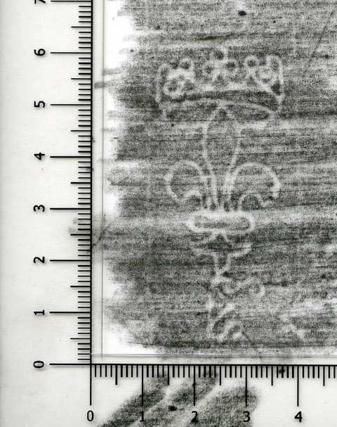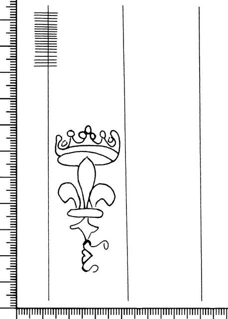 Tipo de filigrana: Sencilla Parte estudiada: Toda la filigrana Código del Motivo: T.01.02.00 Descripción: Flor de lis Encima corona e iniciales debajo Estructura: Tradicional de líneas Altura (mm): 57 Anchura (mm): 25 Tipo de papel: Verjurado Posición en la hoja: Derecha centro Nº de corondeles en la hoja: 16 Distancia entre corondeles: 12-16-30-30-29-28-28-28-28-28-28-(29)-28-29-30-17-7 Situada entre el corondel 11 y el corondel 12 Posición en relación al texto: Perpendicular al texto hacia abajo Origen de los datos: Datos obtenidos del original Información adicional: Son visibles las puntadas que unen la filigrana a la verjura. El corondel de apoyo se ve muy mal y es más grueso que los demás. Todos los corondeles torcidosSe acumula pulpa entre los corondeles de apoyo y los bordes. Otros folios o signaturas del documento donde aparece la filigrana: Filigranas idénticas: Folio 2 de este mismo libro. País de localizatión del molino: Francia o Lorena Autor de los datos de este registro: María Dolores Díaz de Miranda Macías Tipo de uso: Papel para escribir Estado de la hoja: Cortados todos los bordes Altura de la hoja: 302 Anchura de la hoja: 425 Color de la hoja: Natural Estado de conservación: Malo pH del papel: 6,42-6,50 Indicador de pH: Por electrodo de contacto Institución: Archivo del Monasterio de San Pelayo