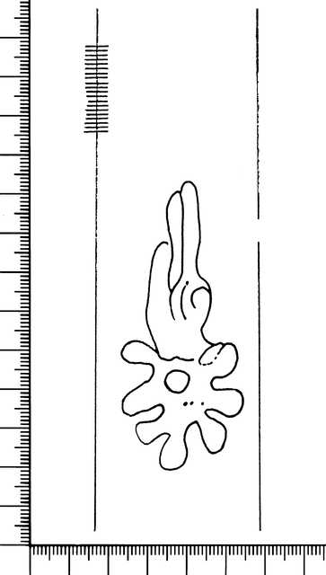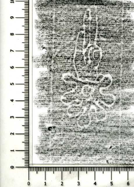 Tipo de filigrana: Sencilla Parte estudiada: Toda la filigrana Código del Motivo: B.04.03.00 Descripción: Mano bendiciendo, puño festoneado, en el interior círculo Estructura: Tradicional de líneas Altura (mm): 73 Anchura (mm): 33 Tipo de papel: Verjurado Posición en la hoja: Derecha centro Nº de corondeles en la hoja: 9 Distancia entre corondeles: 37-42-42-42-42-40-44-(42)-42-37 Situada entre el corondel 7 y el corondel 8 Posición en relación al texto: Perpendicular al texto hacia arriba Origen de los datos: Datos obtenidos del original Información adicional: Son visibles las puntadas que unen la filigrana a la verjura. Tiene torcido el corondel nº 5. Las puntadas cadenetas se ven gruesas. Otros folios o signaturas del documento donde aparece la filigrana: Filigranas idénticas: - Folios 7, 8 bis, 9 y 54 de este mismo libro. Filigranas gemelas: - Folio 12 ter, de este mismo libro. Autor de los datos de este registro: María Dolores Díaz de Miranda Macías Tipo de uso: Papel para escribir Estado de la hoja: Cortado borde derecho e izquierdo Altura de la hoja: 296 Anchura de la hoja: 410 Color de la hoja: Natural Estado de conservación: Malo pH del papel: 6,43 Indicador de pH: Por electrodo de contacto Institución: Archivo del Monasterio de San Pelayo