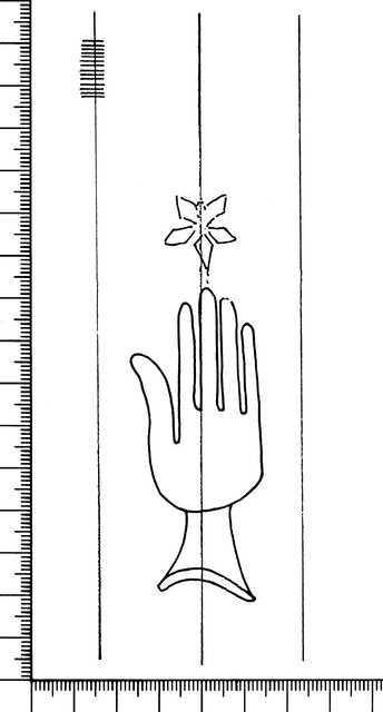Tipo de filigrana: Sencilla Parte estudiada: Toda la filigrana Código del Motivo: B.02.06.00 Descripción: Mano con cuatro dedos juntos y el pulgar separado Encima flor de cinco puntas Estructura: Tradicional de líneas Altura (mm): 98 Anchura (mm): 30 Tipo de papel: Verjurado Posición en la hoja: Derecha centro Nº de corondeles en la hoja: 15 Distancia entre corondeles: 3-21-35-35-35-35-35-31-35-36-(25)-(23)-35-36-21-3 Situada entre el corondel 10 y el corondel 12 Posición en relación al texto: Perpendicular al texto hacia arriba Origen de los datos: Datos obtenidos del original Información adicional: Son visibles las puntadas que unen la filigrana a la verjura. Las puntadas cadenetas son anchas y bien realizadas. Autor de los datos de este registro: María Dolores Díaz de Miranda Macías Tipo de uso: Papel para escribir Estado de la hoja: Sin cortar bordes Altura de la hoja: 315 Anchura de la hoja: 446 Color de la hoja: Natural Estado de conservación: Regular pH del papel: 7,66 Indicador de pH: Por electrodo de contacto Institución: Archivo del Monasterio de San Pelayo