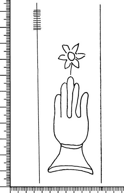Tipo de filigrana: Sencilla Parte estudiada: Toda la filigrana Código del Motivo: B.02.02.03 Descripción: Mano con cuatro dedos juntos y el pulgar separado Encima flor de seis puntas Estructura: Tradicional de líneas Altura (mm): 83 Anchura (mm): 30 Tipo de papel: Verjurado Posición en la hoja: Derecha centro Nº de corondeles en la hoja: 13 Distancia entre corondeles: 7-21-39-40-41-40-39-40-39-(40)-37-39-19-9 Situada entre el corondel 9 y el corondel 10 Posición en relación al texto: Perpendicular al texto hacia arriba Origen de los datos: Datos obtenidos del original Información adicional: Son visibles las puntadas que unen la filigrana a la verjura. Otros folios o signaturas del documento donde aparece la filigrana: Filigranas idénticas: Folio 40 de este mismo libro. Autor de los datos de este registro: María Dolores Díaz de Miranda Macías Tipo de uso: Papel para escribir Estado de la hoja: Cortado borde derecho e izquierdo Altura de la hoja: 315 Anchura de la hoja: 450 Color de la hoja: Natural Estado de conservación: Regular pH del papel: 7,97-8,09 Indicador de pH: Por electrodo de contacto Institución: Archivo del Monasterio de San Pelayo