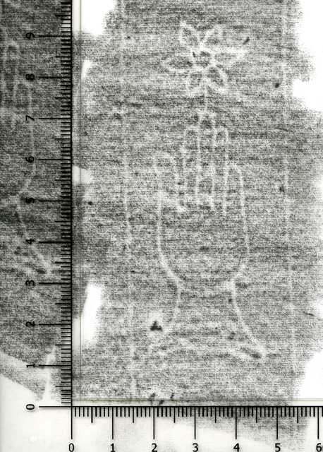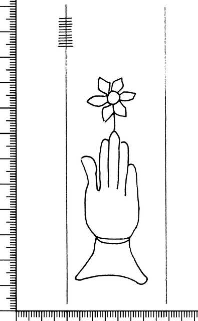 Tipo de filigrana: Sencilla Parte estudiada: Toda la filigrana Código del Motivo: B.02.02.03 Descripción: Mano con cuatro dedos juntos y el pulgar separado Encima flor de seis puntas Estructura: Tradicional de líneas Altura (mm): 84 Anchura (mm): 30 Tipo de papel: Verjurado Posición en la hoja: Izquierda centro Nº de corondeles en la hoja: 13 Distancia entre corondeles: 7-20-39-40-(40)-40-38-38-39-39-39-40-20-9 Situada entre el corondel 4 y el corondel 5 Posición en relación al texto: Perpendicular al texto hacia arriba Origen de los datos: Datos obtenidos del original Información adicional: Son visibles las puntadas que unen la filigrana a la verjura. Se acumula pulpa entre los corondeles de apoyo y los bordes de la hoja. Otros folios o signaturas del documento donde aparece la filigrana: Filigranas idénticas: folio 41 de este mismo libro. Autor de los datos de este registro: María Dolores Díaz de Miranda Macías Tipo de uso: Papel para escribir Estado de la hoja: Cortado borde derecho e izquierdo Altura de la hoja: 315 Anchura de la hoja: 448 Color de la hoja: Natural Estado de conservación: Malo pH del papel: 7,62 Indicador de pH: Indicador universal Institución: Archivo del Monasterio de San Pelayo