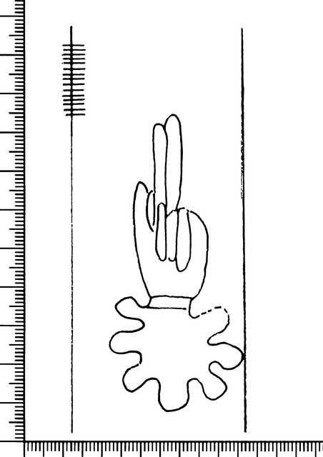 Tipo de filigrana: Sencilla Parte estudiada: Toda la filigrana Código del Motivo: B.04.01.00 Descripción: Mano bendiciendo Puño festoneado Estructura: Tradicional de líneas Altura (mm): 79 Anchura (mm): 34 Tipo de papel: Verjurado Posición en la hoja: Derecha centro Nº de corondeles en la hoja: 11 Distancia entre corondeles: 20-23-42-43-43-42-42-41-(44)-44-25-16 Situada entre el corondel 8 y el corondel 9 Posición en relación al texto: Perpendicular al texto hacia abajo Origen de los datos: Datos obtenidos del original Información adicional: Son visibles las puntadas que unen la filigrana a la verjura. Las puntadas cadenetas son oblícuas y gruesas. Las puntadas de los corondeles de apoyo parecen más simétricas que las de los demás corondeles. Tiene torcidos los corondeles nº 2 y 8. Autor de los datos de este registro: María Dolores Díaz de Miranda Macías Tipo de uso: Papel para escribir Estado de la hoja: Sin cortar bordes Altura de la hoja: 302 Anchura de la hoja: 425 Color de la hoja: Natural Estado de conservación: Bueno pH del papel: 6,52 Indicador de pH: Por electrodo de contacto Institución: Archivo del Monasterio de San Pelayo