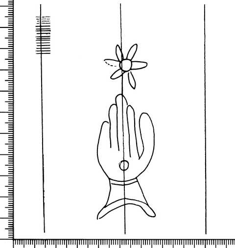 Tipo de filigrana: Sencilla Parte estudiada: Toda la filigrana Código del Motivo: B.02.04.03 Descripción: Mano con cuatro dedos juntos y el pulgar separado Encima flor de seis puntas Dentro un círculo Estructura: Tradicional de líneas Altura (mm): 82 Anchura (mm): 27 Tipo de papel: Verjurado Posición en la hoja: Medio centro Nº de corondeles en la hoja: 6 Distancia entre corondeles: 10-18-37-(39)-(39)-40-37 Situada entre el corondel 3 y el corondel 5 Posición en relación al texto: Perpendicular al texto hacia abajo Origen de los datos: Datos obtenidos del original Información adicional: Son visibles las puntadas que unen la filigrana a la verjura. El corondel de apoyo se ve mal y tiene las puntadas distintas a los demás corondeles. Haría pareja con el folio 77 que ha sido sustraído. Autor de los datos de este registro: María Dolores Díaz de Miranda Macías Tipo de uso: Papel para escribir Estado de la hoja: Cortado borde derecho Altura de la hoja: 310 Anchura de la hoja: 220 Color de la hoja: Natural Estado de conservación: Malo pH del papel: 6,75 Indicador de pH: Por electrodo de contacto Institución: Archivo del Monasterio de San Pelayo