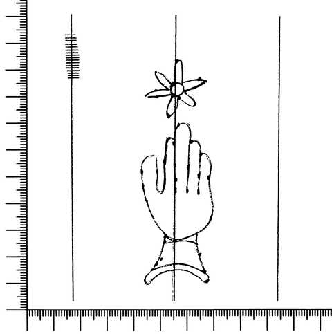 Tipo de filigrana: Sencilla Parte estudiada: Toda la filigrana Código del Motivo: B.02.02.03 Descripción: Mano con cuatro dedos juntos y el pulgar separado Encima flor de seis puntas Estructura: Tradicional de líneas Altura (mm): 85 Anchura (mm): 26 Tipo de papel: Verjurado Posición en la hoja: Derecha centro Nº de corondeles en la hoja: 13 Distancia entre corondeles: 8-17-39-39-39-40-38-40-(39)-(39)-40-39-17-8 Situada entre el corondel 8 y el corondel 10 Posición en relación al texto: Perpendicular al texto hacia arriba Origen de los datos: Datos obtenidos del original Información adicional: Son visibles las puntadas que unen la filigrana a la verjura. Las puntadas de los corondeles de apoyo son más tenues que la de los corondeles. Se ven peor éstos corondeles que los de apoyo. Otros folios o signaturas del documento donde aparece la filigrana: Filigranas idénticas: - Folio 79-80 de este mismo libro. Autor de los datos de este registro: María Dolores Díaz de Miranda Macías Tipo de uso: Papel para escribir Estado de la hoja: Sin cortar bordes Altura de la hoja: 309 Anchura de la hoja: 442 Color de la hoja: Natural Estado de conservación: Regular pH del papel: 8,04 - 8,20 Indicador de pH: Por electrodo de contacto Información adicional: pH 8,30 por indicador universal Institución: Archivo del Monasterio de San Pelayo
