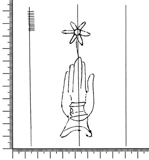 Tipo de filigrana: Sencilla Parte estudiada: Toda la filigrana Código del Motivo: B.02.05.00 Descripción: Mano con cuatro dedos juntos y el pulgar separado Encima flor de seis puntas Dentro motivo secundario Estructura: Tradicional de líneas Altura (mm): 94 Anchura (mm): 26 Tipo de papel: Verjurado Posición en la hoja: Izquierda centro Nº de corondeles en la hoja: 12 Distancia entre corondeles: 3-19-38-40-(40)-(39)-40-39-40-39-42-37-19 Situada entre el corondel 4 y el corondel 6 Posición en relación al texto: Perpendicular al texto hacia abajo Origen de los datos: Datos obtenidos del original País de localizatión del molino: Italia Lugar del molino: Liguria Autor de los datos de este registro: María Dolores Díaz de Miranda Macías Tipo de uso: Papel para escribir Estado de la hoja: Cortado borde izquierdo, derecho e inferior Altura de la hoja: 309 Anchura de la hoja: 435 Color de la hoja: Natural Estado de conservación: Regular pH del papel: 6,98 - 7,10 Indicador de pH: Por electrodo de contacto Institución: Archivo del Monasterio de San Pelayo