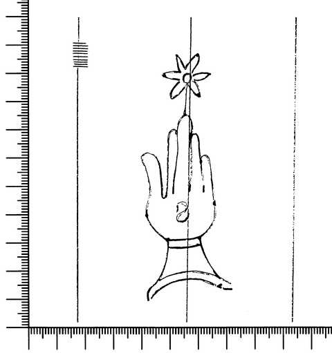 Tipo de filigrana: Sencilla Parte estudiada: Toda la filigrana Código del Motivo: B.02.04.00 Descripción: Mano con cuatro dedos juntos y el pulgar separado Encima flor de seis puntas Dentro una S invertida Estructura: Tradicional de líneas Altura (mm): 88 Anchura (mm): 32 Tipo de papel: Verjurado Posición en la hoja: Izquierda centro Nº de corondeles en la hoja: 13 Distancia entre corondeles: 7-19-39-40-(40)-(38)-40-38-39-39-39-38-22-8 Situada entre el corondel 4 y el corondel 6 Posición en relación al texto: Perpendicular al texto hacia arriba Origen de los datos: Datos obtenidos del original Información adicional: Son visibles las puntadas que unen la filigrana a la verjura. Otros folios o signaturas del documento donde aparece la filigrana: Filigranas idénticas: - Folio 175-173 de este mismo libro. Autor de los datos de este registro: María Dolores Díaz de Miranda Macías Tipo de uso: Papel para escribir Estado de la hoja: Sin cortar bordes Altura de la hoja: 335 Anchura de la hoja: 446 Color de la hoja: Natural Estado de conservación: Regular pH del papel: 7,74 Indicador de pH: Por electrodo de contacto Institución: Archivo del Monasterio de San Pelayo
