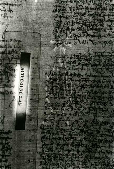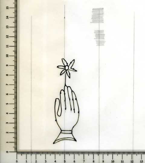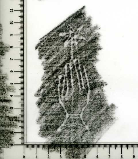 Tipo de filigrana: Sencilla Parte estudiada: Toda la filigrana Código del Motivo: B.02.02.03 Descripción: Mano con cuatro dedos juntos y el pulgar separado. Encima flor de seis puntas Estructura: Tradicional de líneas Altura (mm): 90 Anchura (mm): 25 Tipo de papel: Verjurado Posición en la hoja: Derecha centro Nº de corondeles en la hoja: 7 Distancia entre corondeles: Situada entre el corondel 4 y el corondel 6 Posición en relación al texto: Perpendicular al texto hacia arriba Origen de los datos: Datos obtenidos del original Información adicional: Se ve muy mal el corondel de apoyo y el corondel portador. Se acumula pulpa entre el corondel de apoyo y el borde de la hoja. Son visibles las puntadas que unen la filigrana a la verjura. Otros folios o signaturas del documento donde aparece la filigrana: Filigranas idénticas: - Folios 11-34 y 27-28 de este mismo libro. Autor de los datos de este registro: María Dolores Díaz de Miranda Macías Tipo de uso: Papel para escribir Estado de la hoja: Cortado borde derecho Altura de la hoja: 315 Anchura de la hoja: 225 Color de la hoja: Natural Estado de conservación: Bueno pH del papel: 7,48 Indicador de pH: Por electrodo de contacto Institución: Archivo de la Catedral de Oviedo.