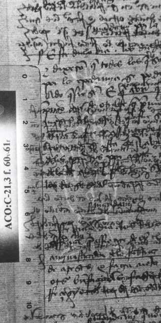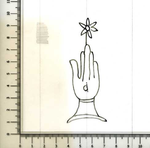 Tipo de filigrana: Sencilla Parte estudiada: Toda la filigrana Código del Motivo: B.02.04.05 Descripción: Mano con cuatro dedos juntos y el pulgar separado. Encima flor de seis puntas. Dentro letra Estructura: Tradicional de líneas Altura (mm): 86 Anchura (mm): 34 Tipo de papel: Verjurado Posición en la hoja: Derecha centro Nº de corondeles en la hoja: 6 Distancia entre corondeles: Situada entre el corondel 4 y el corondel 6 Posición en relación al texto: Perpendicular al texto hacia arriba Origen de los datos: Datos obtenidos del original Información adicional: Se ve muy mal el corondel de apoyo y los corondeles 2 y 3. Son visibles las puntadas que unen la filigrana a la verjura. Otros folios o signaturas del documento donde aparece la filigrana: Filigranas idénticas: - Folios 59-62, 46-52, 48-47, 64-57 de este mismo libro. Autor de los datos de este registro: María Dolores Díaz de Miranda Macías Tipo de uso: Papel para escribir Estado de la hoja: Cortado borde derecho Altura de la hoja: 310 Anchura de la hoja: 221 Color de la hoja: Natural Estado de conservación: Bueno pH del papel: 7,67 Indicador de pH: Por electrodo de contacto Institución: Archivo de la Catedral de Oviedo.