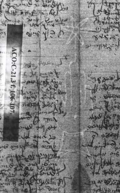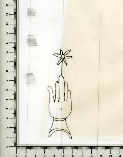 Tipo de filigrana: Sencilla Parte estudiada: Toda la filigrana Código del Motivo: B.02.02.03 Descripción: Mano con cuatro dedos juntos y el pulgar separado. Encima flor de seis puntas Estructura: Tradicional de líneas Altura (mm): 96 Anchura (mm): 26 Tipo de papel: Verjurado Posición en la hoja: Medio centro Nº de corondeles en la hoja: 6 Distancia entre corondeles: Situada entre el corondel 3 y el corondel 5 Posición en relación al texto: Perpendicular al texto hacia abajo Origen de los datos: Datos obtenidos del original Información adicional: Se acumula pulpa entre el corondel de apoyo y el borde de la hoja. Casi no se distingue el corondel de apoyo. Son visibles las puntadas que unen la filigrana a la verjura. Autor de los datos de este registro: María Dolores Díaz de Miranda Macías Tipo de uso: Papel para escribir Estado de la hoja: Cortado borde derecho e izquierdo Altura de la hoja: 314 Anchura de la hoja: 223 Color de la hoja: Natural Estado de conservación: Bueno pH del papel: 7,59-7,92 (sube a 8,00 y baja) Indicador de pH: Por electrodo de contacto Institución: Archivo de la Catedral de Oviedo.