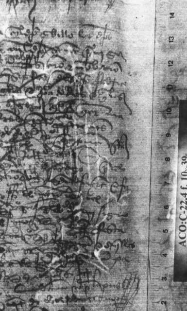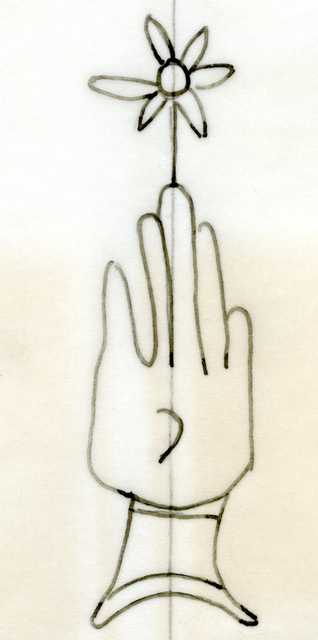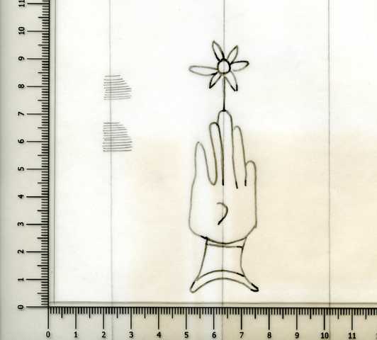 Tipo de filigrana: Sencilla Parte estudiada: Toda la filigrana Código del Motivo: B.02.04.04 Descripción: Mano con cuatro dedos juntos y el pulgar separado. Encima flor de seis puntas Estructura: Tradicional de líneas Altura (mm): 93 Anchura (mm): 26 Tipo de papel: Verjurado Posición en la hoja: Izquierda centro Nº de corondeles en la hoja: 6 Distancia entre corondeles: Situada entre el corondel 1 y el corondel 3 Posición en relación al texto: Perpendicular al texto hacia arriba Origen de los datos: Datos obtenidos del original Información adicional: Se acumula pulpa entre el corondel de apoyo y el borde de la hoja. Son visibles las puntadas que unen la filigrana a la verjura. Otros folios o signaturas del documento donde aparece la filigrana: Filigranas idénticas: - Folios 6-43, 8-41 y 22-27 de este mismo libro. Filigranas gemelas: - 000182. Autor de los datos de este registro: María Dolores Díaz de Miranda Macías Tipo de uso: Papel para escribir Estado de la hoja: Cortado borde izquierdo Altura de la hoja: 310 Anchura de la hoja: 225 Color de la hoja: Natural Estado de conservación: Regular pH del papel: 6,92 Indicador de pH: Por electrodo de contacto Institución: Archivo de la Catedral de Oviedo.