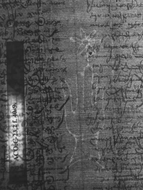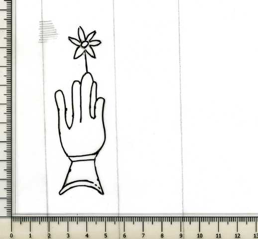 Tipo de filigrana: Sencilla Parte estudiada: Toda la filigrana Código del Motivo: B.01.02.03 Descripción: Mano con cuatro dedos juntos y el pulgar separado. Encima flor de seis puntas Estructura: Tradicional de líneas Altura (mm): 91 Anchura (mm): 27 Tipo de papel: Verjurado Posición en la hoja: Medio centro Nº de corondeles en la hoja: 7 Distancia entre corondeles: Situada entre el corondel 4 y el corondel 5 Posición en relación al texto: Perpendicular al texto hacia abajo Origen de los datos: Datos obtenidos del original Información adicional: Son visibles las puntadas que unen la filigrana a la verjura. Casi no se distingue el corondel de apoyo. Otros folios o signaturas del documento donde aparece la filigrana: Filigranas idénticas: - Folio 7-42 de este mismo libro. Autor de los datos de este registro: María Dolores Díaz de Miranda Macías Tipo de uso: Papel para escribir Estado de la hoja: Cortado borde izquierdo Altura de la hoja: 310 Anchura de la hoja: 226 Color de la hoja: Natural Estado de conservación: Bueno pH del papel: 6,37 Indicador de pH: Por electrodo de contacto Institución: Archivo de la Catedral de Oviedo.