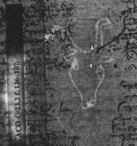 Tipo de filigrana: Sencilla Parte estudiada: Toda la filigrana Código del Motivo: C.01.05.01 Descripción: Cabeza de vaca. Estructura: Tradicional de líneas Altura (mm): 51 Anchura (mm): 38 Tipo de papel: Verjurado Posición en la hoja: Medio centro Nº de corondeles en la hoja: 6 Distancia entre corondeles: Situada entre el corondel 3 y el corondel 4 Posición en relación al texto: Perpendicular al texto hacia arriba Origen de los datos: Datos obtenidos del original Información adicional: Son visibles las puntadas que unen la filigrana a la verjura. Se ven muy mal los corondeles. Otros folios o signaturas del documento donde aparece la filigrana: Filigranas idénticas: - Folio 143v-100r de este mismo libro. Filigranas similares: - 000193, 000194 y 000195. Autor de los datos de este registro: María Dolores Díaz de Miranda Macías Tipo de uso: Papel para escribir Estado de la hoja: Cortado borde derecho e izquierdo Altura de la hoja: 310 Anchura de la hoja: 215 Color de la hoja: Natural Estado de conservación: Bueno pH del papel: 7,12 Indicador de pH: Por electrodo de contacto Institución: Archivo de la Catedral de Oviedo.