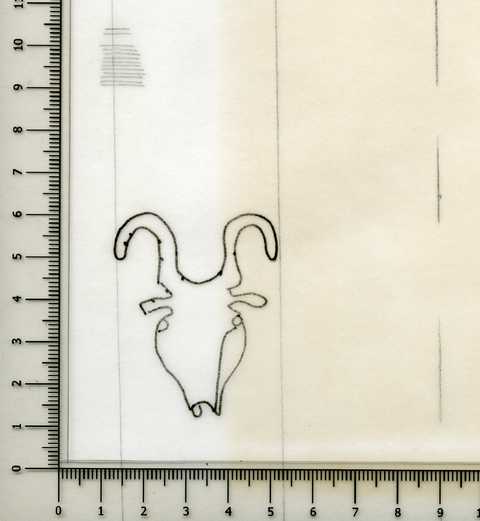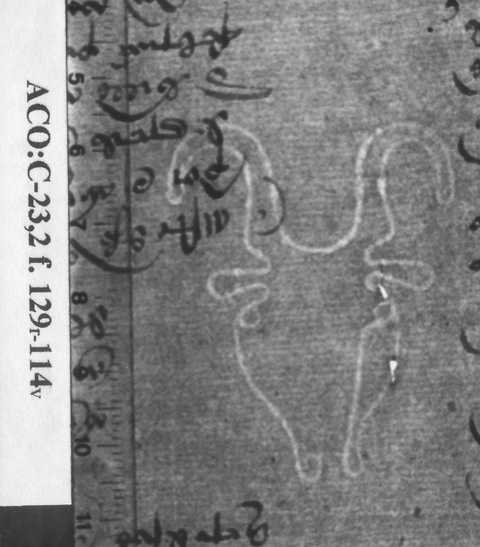 Tipo de filigrana: Sencilla Parte estudiada: Toda la filigrana Código del Motivo: C.01.05.01 Descripción: Cabeza de vaca. Estructura: Tradicional de líneas Altura (mm): 49 Anchura (mm): 38 Tipo de papel: Verjurado Posición en la hoja: Medio centro Nº de corondeles en la hoja: 5 Distancia entre corondeles: Situada entre el corondel 2 y el corondel 3 Posición en relación al texto: Perpendicular al texto hacia abajo Origen de los datos: Datos obtenidos del original Información adicional: Son visibles las puntadas que unen la filigrana a la verjura. Se ven muy mal los corondeles. Otros folios o signaturas del documento donde aparece la filigrana: Filigranas idénticas: - Folios 116v-127r y 104v-139r de este mismo libro. Filigranas similares: - 000192, 000193 y 000195. Autor de los datos de este registro: María Dolores Díaz de Miranda Macías Tipo de uso: Papel para escribir Estado de la hoja: Cortado borde derecho e izquierdo Altura de la hoja: 311 Anchura de la hoja: 218 Color de la hoja: Natural Estado de conservación: Bueno pH del papel: 7,30 Indicador de pH: Por electrodo de contacto Institución: Archivo de la Catedral de Oviedo.