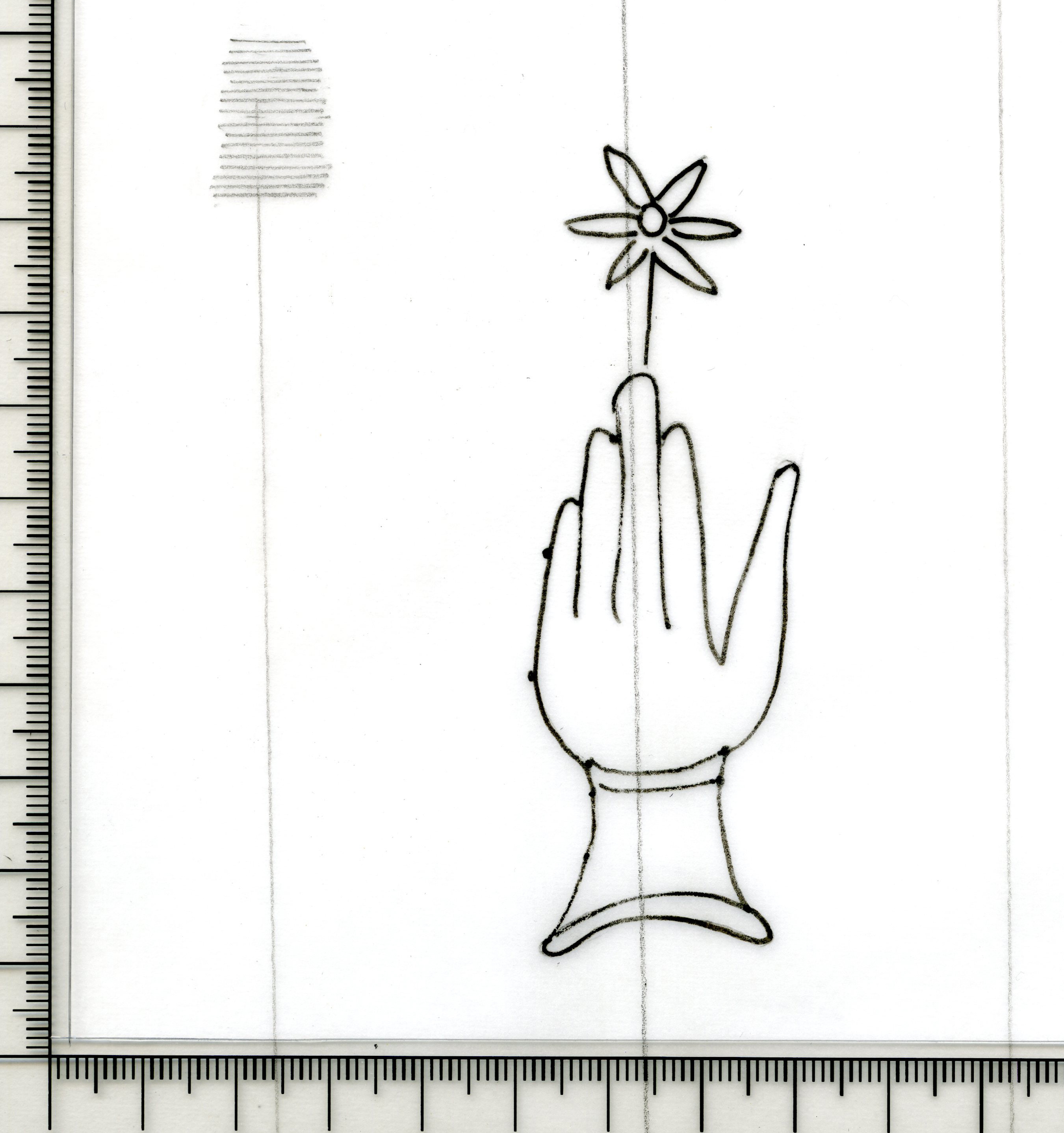 Tipo de filigrana: Sencilla Parte estudiada: Toda la filigrana Código del Motivo: B.02.02.03 Descripción: Mano con cuatro dedos juntos y el pulgar separado. Encima flor de seis puntas Estructura: Tradicional de líneas Altura (mm): 90 Anchura (mm): 28 Tipo de papel: Verjurado Posición en la hoja: Medio centro Nº de corondeles en la hoja: 6 Distancia entre corondeles: Situada entre el corondel 2 y el corondel 4 Posición en relación al texto: Perpendicular al texto hacia arriba Origen de los datos: Datos obtenidos del original Información adicional: Son visibles las puntadas que unen la filigrana a la verjura. Tiene torcidos los corondeles nº 2, 5 y 6. Autor de los datos de este registro: María Dolores Díaz de Miranda Macías y Ana María Herrero Estado de la hoja: Cortado borde derecho Altura de la hoja: 314 Anchura de la hoja: 224 Color de la hoja: Natural Estado de conservación: Bueno pH del papel: 6,70 Institución: Archivo de la Catedral de Oviedo.