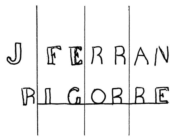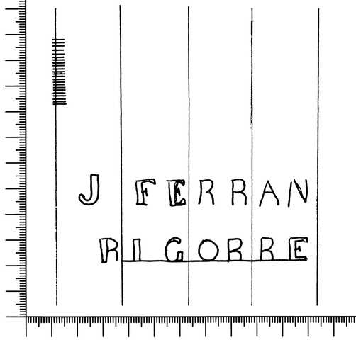 Tipo de filigrana: Doble Parte estudiada: Derecha Código del Motivo: W.06.00.00 Descripción: Letras: J. FERRAN / RIGORRE Estructura: Tradicional de líneas Altura (mm): 35 Anchura (mm): 90 Tipo de papel: Verjurado Posición en la hoja: Derecha centro Nº de corondeles en la hoja: 18 Distancia entre corondeles: Situada entre el corondel 12 y el corondel 16 Posición en relación al texto: Perpendicular al texto hacia arriba Origen de los datos: Datos obtenidos del original Información adicional: La filigrana principal es la 000207. Autor de los datos de este registro: María Dolores Díaz de Miranda Macías Tipo de uso: Papel de guardas Estado de la hoja: Cortados todos los bordes Altura de la hoja: 288 Anchura de la hoja: 431 Color de la hoja: Natural Estado de conservación: Restaurado pH del papel: 7,43 (antes de restaurar) Indicador de pH: Por electrodo de contacto Institución: Archivo de Juntas del Principado de Asturias.