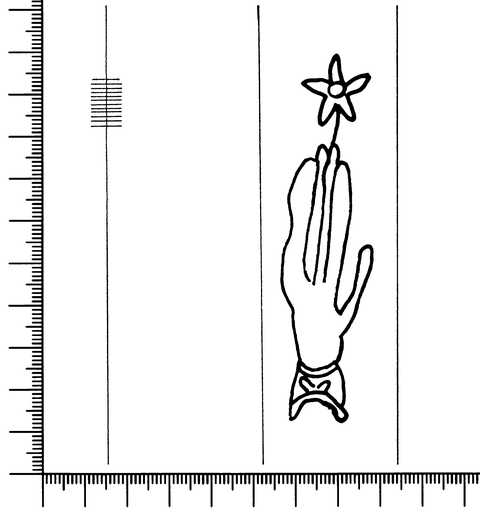 Tipo de filigrana: Sencilla Parte estudiada: Toda la filigrana Código del Motivo: B.02.04.99 Descripción: Mano con cuatro dedos juntos y el pulgar separado, sobre la punta del dedo medio tiene una estrella o florón de cinco puntas y en la muñeca la mitad de un corazón. Estructura: Tradicional de líneas Altura (mm): 90 Anchura (mm): 21 Tipo de papel: Verjurado Posición en la hoja: Medio centro Nº de corondeles en la hoja: 7 Distancia entre corondeles: Situada entre el corondel 3 y el corondel 4 Posición en relación al texto: Paralelo al texto en sentido contrario Origen de los datos: Datos obtenidos del original Información adicional: Se observan las huellas de las puntadas que cosen la filigrana a la verjura de la forma. Las puntadas del corondel de apoyo son distintas a los de los demás corondeles. Autor de los datos de este registro: María Dolores Díaz de Miranda Macías Tipo de uso: Papel para escribir Estado de la hoja: Cortados todos los bordes Altura de la hoja: 304 Anchura de la hoja: 209 Color de la hoja: Natural Estado de conservación: Restaurado pH del papel: 5,20 - 5,30 Indicador de pH: Por electrodo de contacto Institución: Biblioteca de la Universidad de Oviedo.