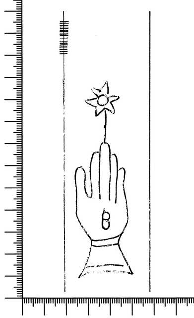 Tipo de filigrana: Sencilla Parte estudiada: Toda la filigrana Código del Motivo: B.02.04.05 Descripción: Mano con cuatro dedos juntos y el pulgar separado Encima flor de seis puntas y dentro dos pequeños círculos en forma de ocho Estructura: Tradicional de líneas Altura (mm): 88 Anchura (mm): 27 Tipo de papel: Verjurado Posición en la hoja: Izquierda centro Nº de corondeles en la hoja: 6 Distancia entre corondeles: 10-17-40-38-(39)-40-38 Situada entre el corondel 4 y el corondel 5 Posición en relación al texto: Perpendicular al texto hacia arriba Origen de los datos: Datos obtenidos del original Información adicional: Son visibles las puntadas que unen la filigrana a la verjura. Autor de los datos de este registro: María Dolores Díaz de Miranda Macías Tipo de uso: Papel para escribir Estado de la hoja: Cortado borde derecho Altura de la hoja: 322 Anchura de la hoja: 222 Color de la hoja: Natural Estado de conservación: Bueno Institución: Archivo del Monasterio de San Pelayo