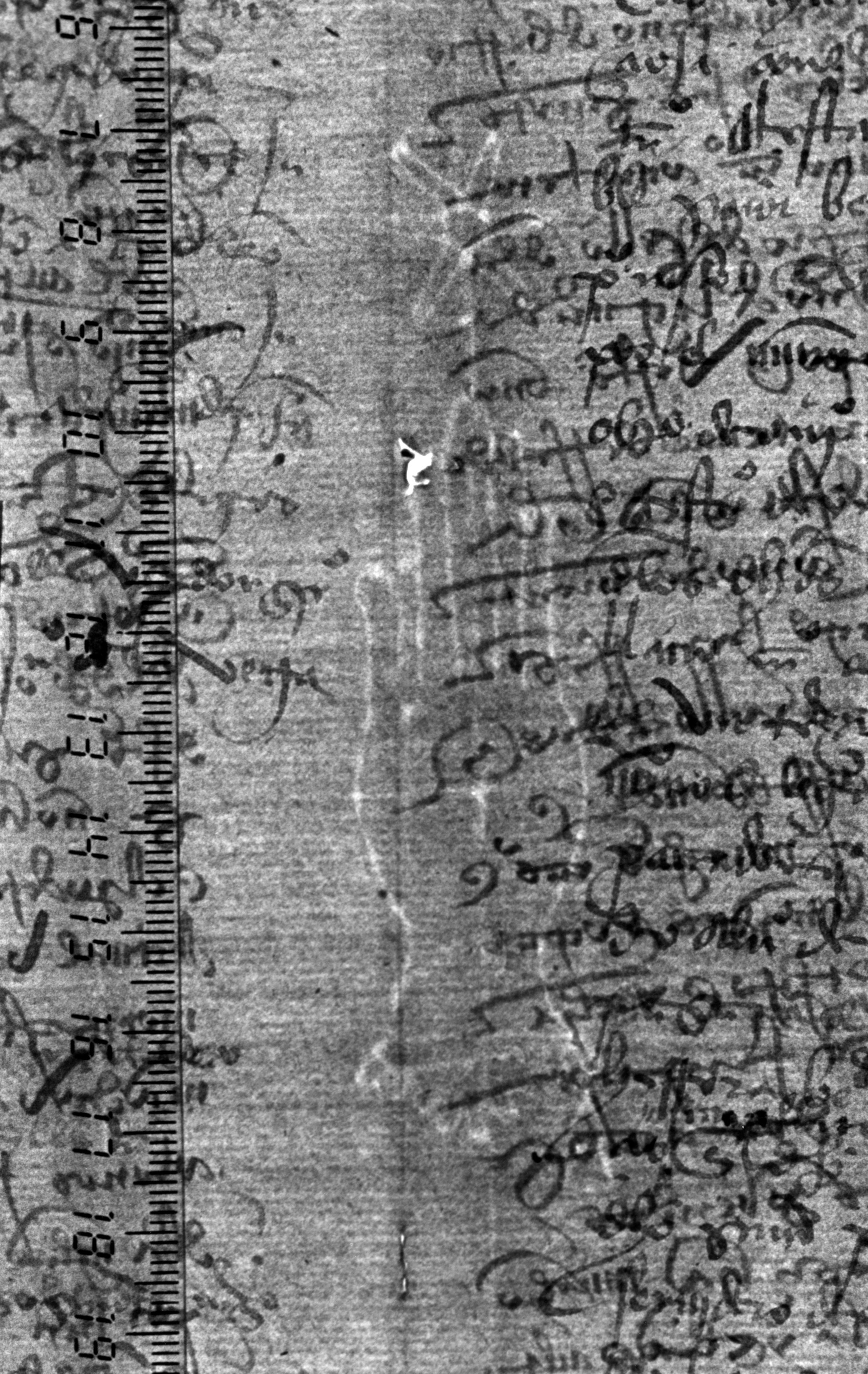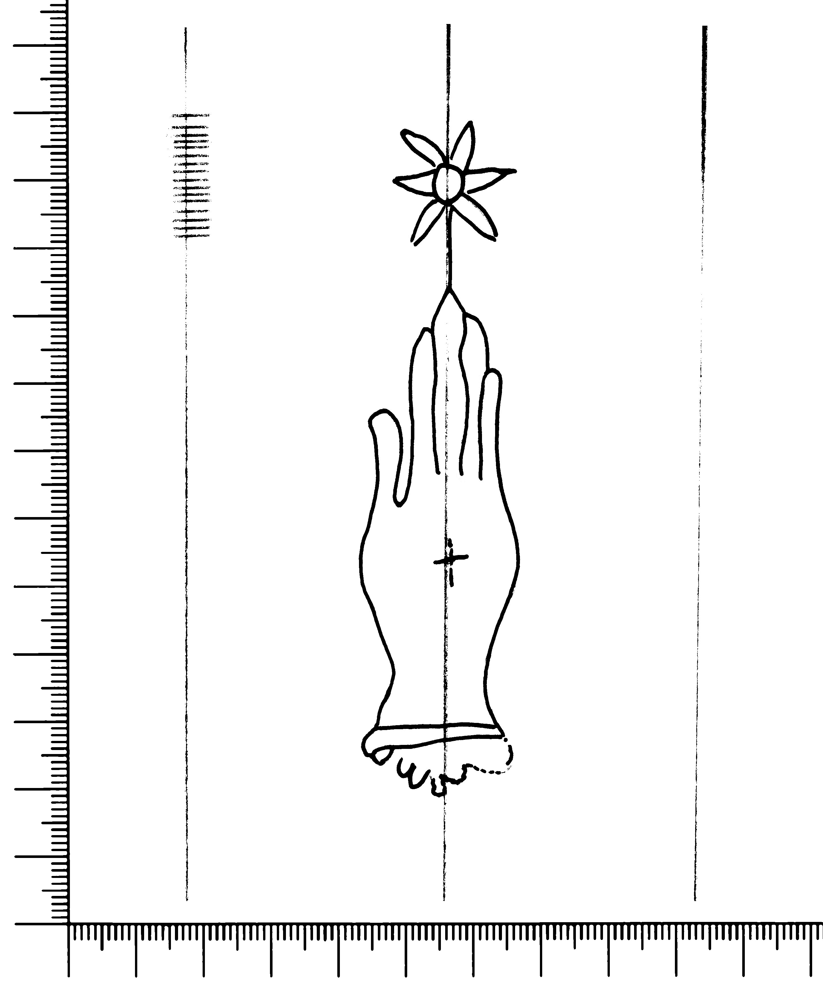 Tipo de filigrana: Sencilla Parte estudiada: Toda la filigrana Código del Motivo: B.02.07.04 Descripción: Mano con cuatro dedos juntos y pulgar separado. Con puño festoneado y encima flor de seis puntas y dentro una pequeña cruz Estructura: Tradicional de líneas Altura (mm): 100 Anchura (mm): 25 Tipo de papel: Verjurado Posición en la hoja: Medio centro Nº de corondeles en la hoja: 7 Distancia entre corondeles: Situada entre el corondel 3 y el corondel 5 Posición en relación al texto: Perpendicular al texto hacia arriba Origen de los datos: Datos obtenidos del original Información adicional: Son visibles las puntadas que unen la filigrana a la verjura. Autor de los datos de este registro: María Dolores Díaz de Miranda Macías y Ana María Herrero Estado de la hoja: Cortado borde izquierdo Altura de la hoja: 310 Anchura de la hoja: 218 Color de la hoja: Natural Estado de conservación: Bueno pH del papel: 7,65 Institución: Archivo de la Catedral de Oviedo.