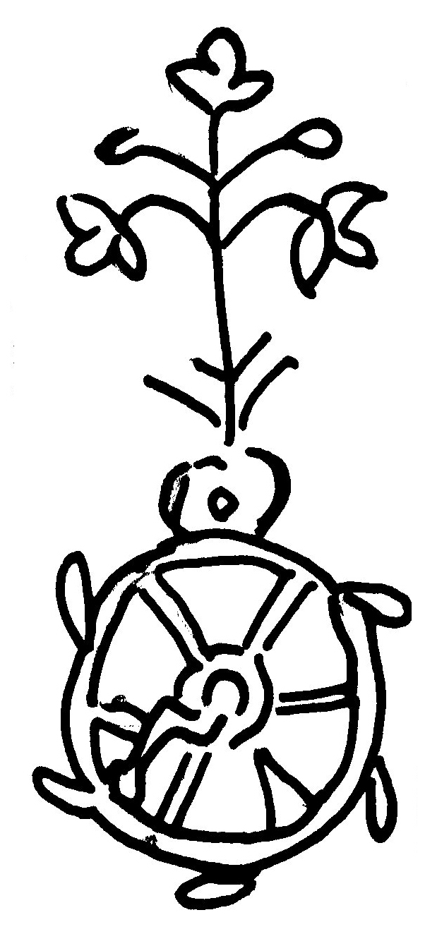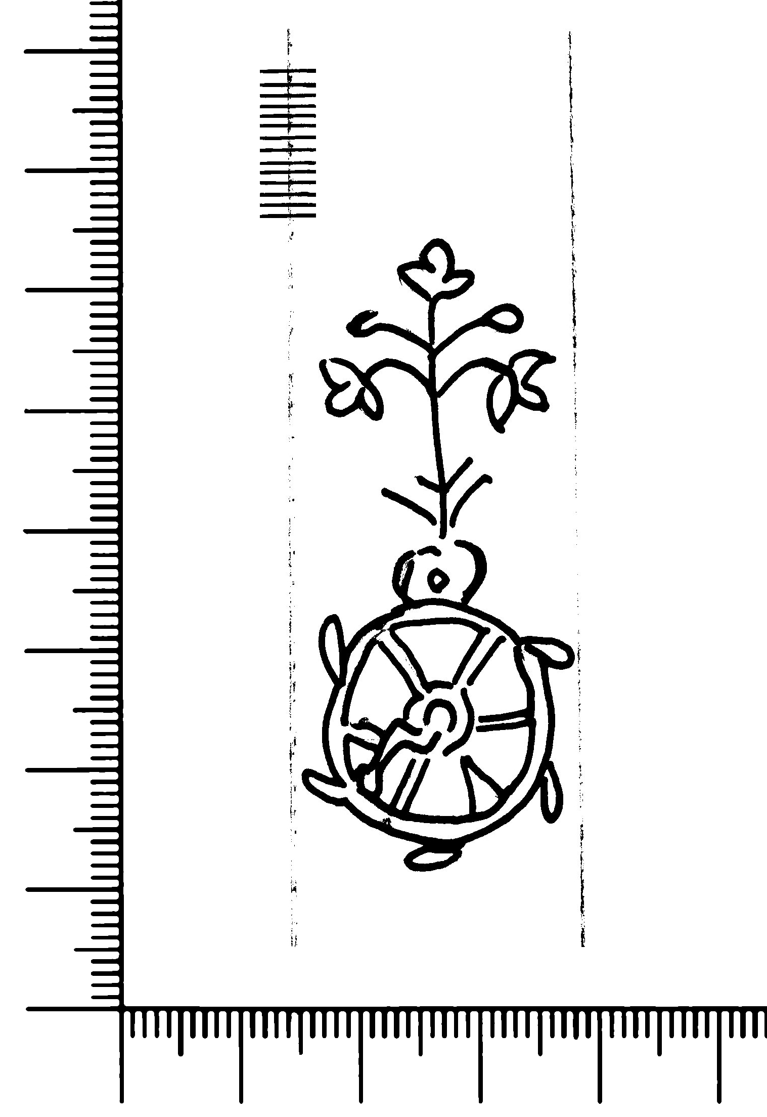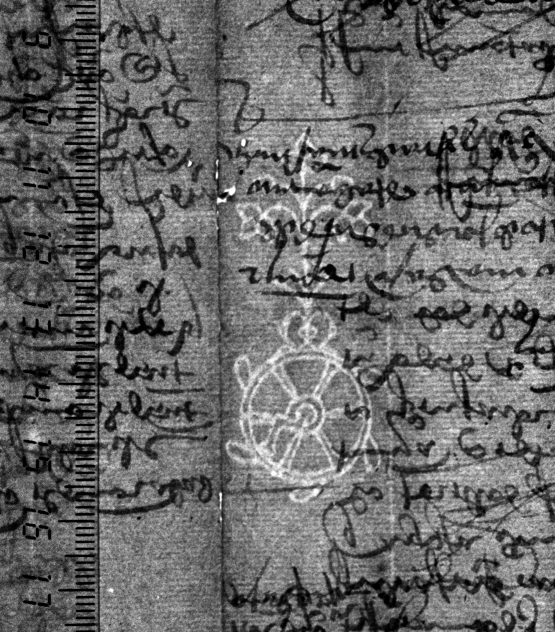 Tipo de filigrana: Sencilla Parte estudiada: Toda la filigrana Código del Motivo: N.07.03.00 Descripción: Rueda con manivela y encima un ramo de flores Estructura: Tradicional de líneas Altura (mm): 55 Anchura (mm): 24 Tipo de papel: Verjurado Posición en la hoja: Derecha centro Nº de corondeles en la hoja: 8 Distancia entre corondeles: Situada entre el corondel 5 y el corondel 6 Posición en relación al texto: Perpendicular al texto hacia abajo Origen de los datos: Datos obtenidos del original Información adicional: Son visibles las puntadas que unen la filigrana a la verjura. Se acumula pulpa entre el corondel de apoyo y el borde externo de la hoja. Autor de los datos de este registro: María Dolores Díaz de Miranda Macías y Ana María Herrero Estado de la hoja: Cortado borde derecho Altura de la hoja: 282 Anchura de la hoja: 104 Color de la hoja: Natural Estado de conservación: Bueno pH del papel: 7,33 Institución: Archivo de la Catedral de Oviedo.