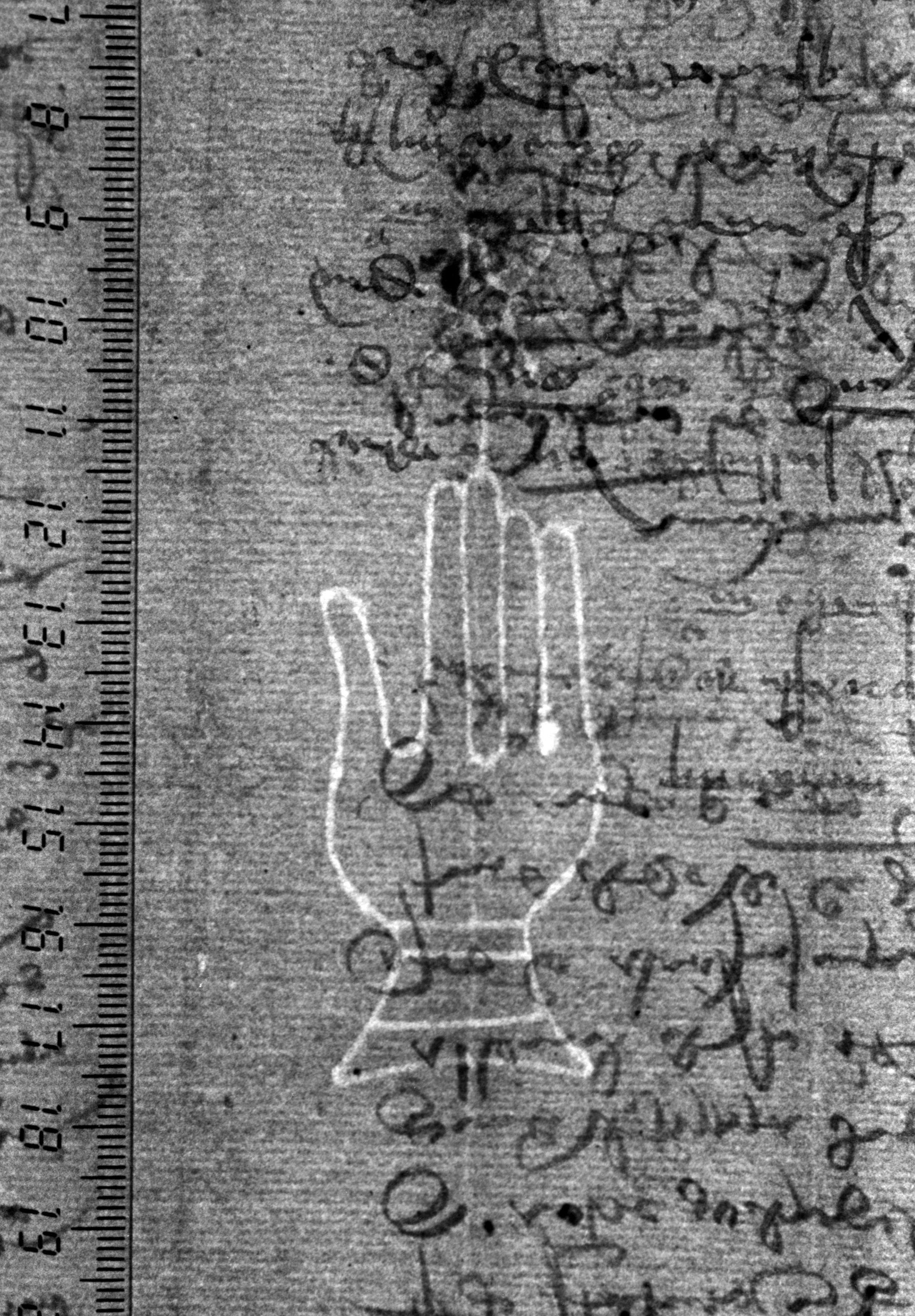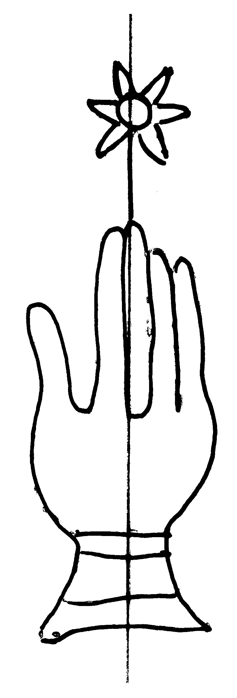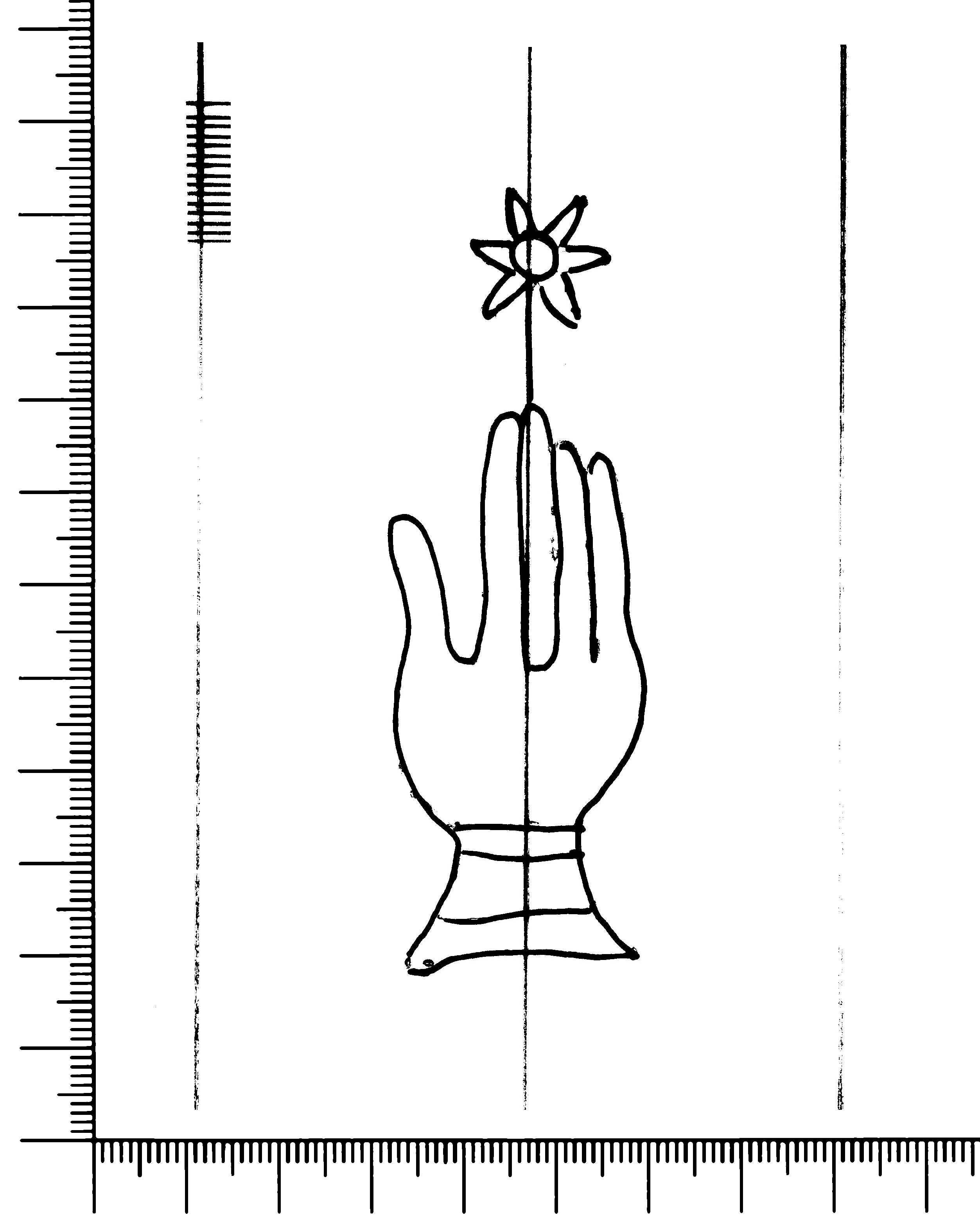 Tipo de filigrana: Sencilla Parte estudiada: Toda la filigrana Código del Motivo: B.02.02.03 Descripción: Mano con cuatro dedos juntos y pulgar separado. Encima flor de seis puntas. Estructura: Tradicional de líneas Altura (mm): 87 Anchura (mm): 27 Tipo de papel: Verjurado Posición en la hoja: Derecha centro Nº de corondeles en la hoja: 7 Distancia entre corondeles: Situada entre el corondel 4 y el corondel 6 Posición en relación al texto: Perpendicular al texto hacia abajo Origen de los datos: Datos obtenidos del original Información adicional: Son visibles las puntadas que unen la filigrana a la verjura. Se acumula pulpa entre el corondel de apoyo y el borde externo de la hoja. Autor de los datos de este registro: María Dolores Díaz de Miranda Macías y Ana María Herrero Estado de la hoja: Cortado borde derecho Altura de la hoja: 313 Anchura de la hoja: 223 Color de la hoja: Natural Estado de conservación: Bueno pH del papel: 7,08 Institución: Archivo de la Catedral de Oviedo.