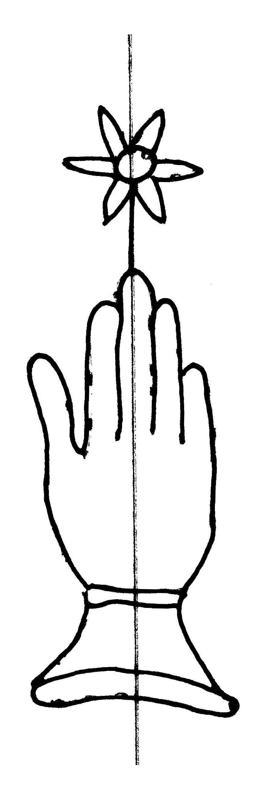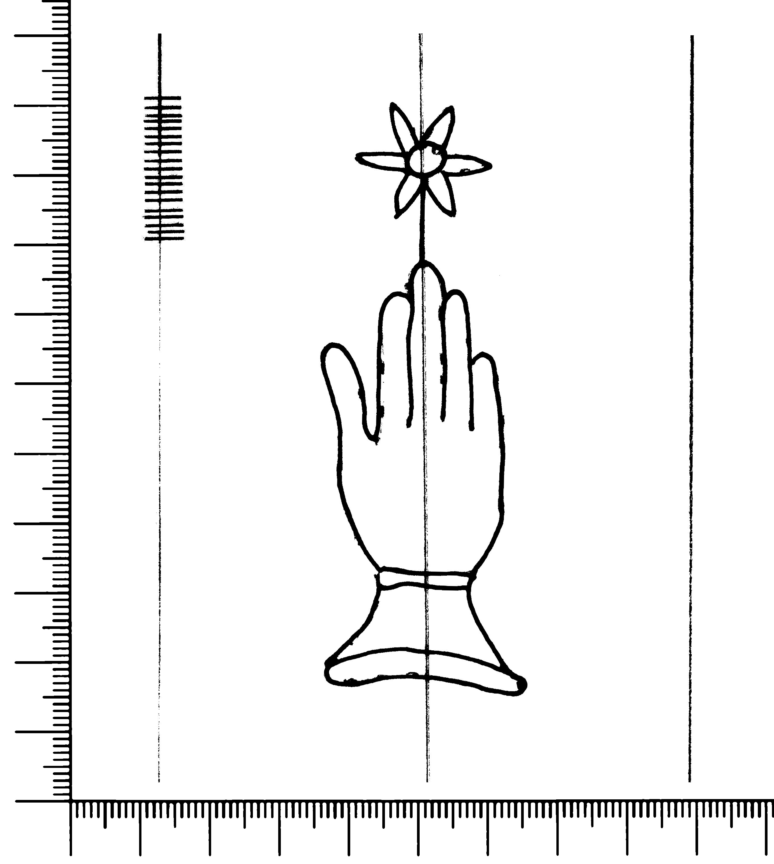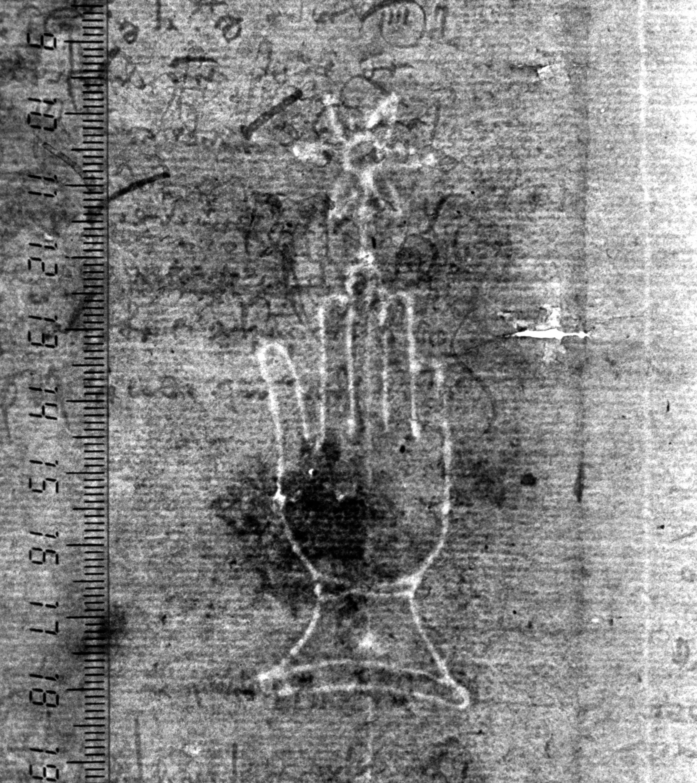 Tipo de filigrana: Sencilla Parte estudiada: Toda la filigrana Código del Motivo: B.02.03.00 Descripción: Mano con cuatro dedos juntos y pulgar separado. Encima flor de seis puntas. Estructura: Tradicional de líneas Altura (mm): 86 Anchura (mm): 29 Tipo de papel: Verjurado Posición en la hoja: Izquierda centro Nº de corondeles en la hoja: 7 Distancia entre corondeles: Situada entre el corondel 2 y el corondel 4 Posición en relación al texto: Perpendicular al texto hacia arriba Origen de los datos: Datos obtenidos del original Información adicional: Son visibles las puntadas que unen la filigrana a la verjura. Autor de los datos de este registro: María Dolores Díaz de Miranda Macías y Ana María Herrero Estado de la hoja: Cortado borde derecho e izquierdo Altura de la hoja: 312 Anchura de la hoja: 222 Color de la hoja: Natural Estado de conservación: Malo pH del papel: 7,97 Institución: Archivo de la Catedral de Oviedo.