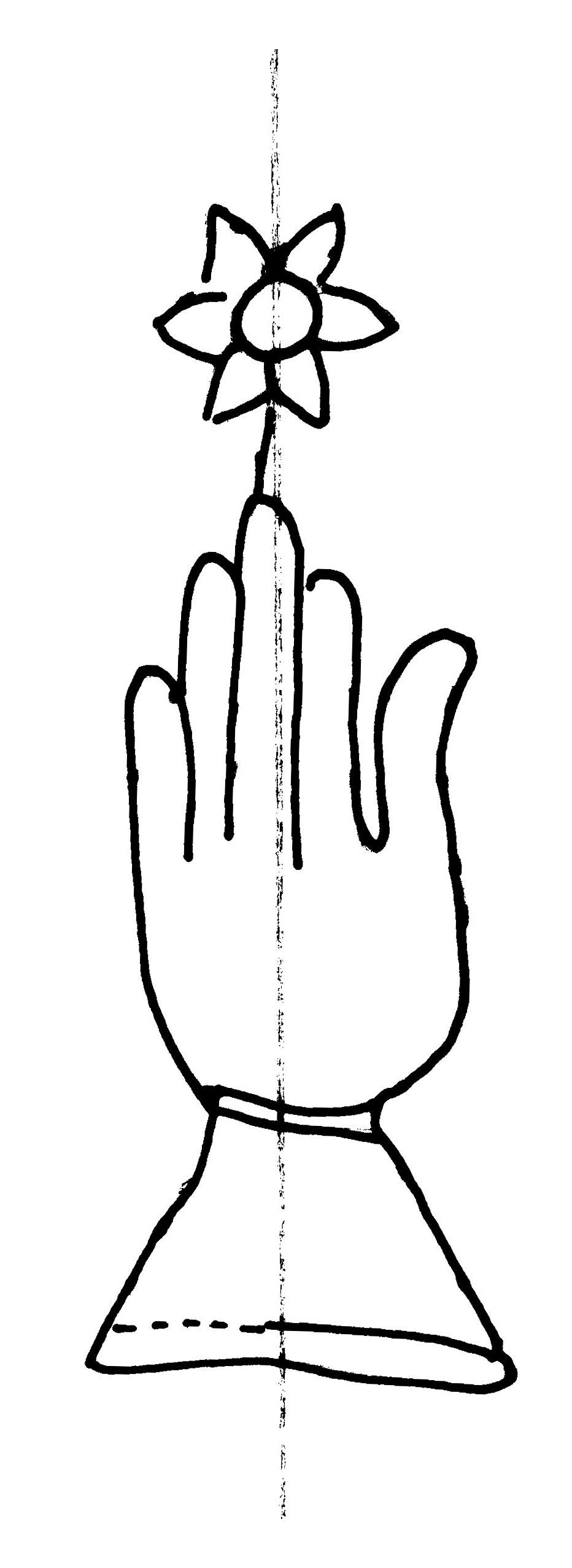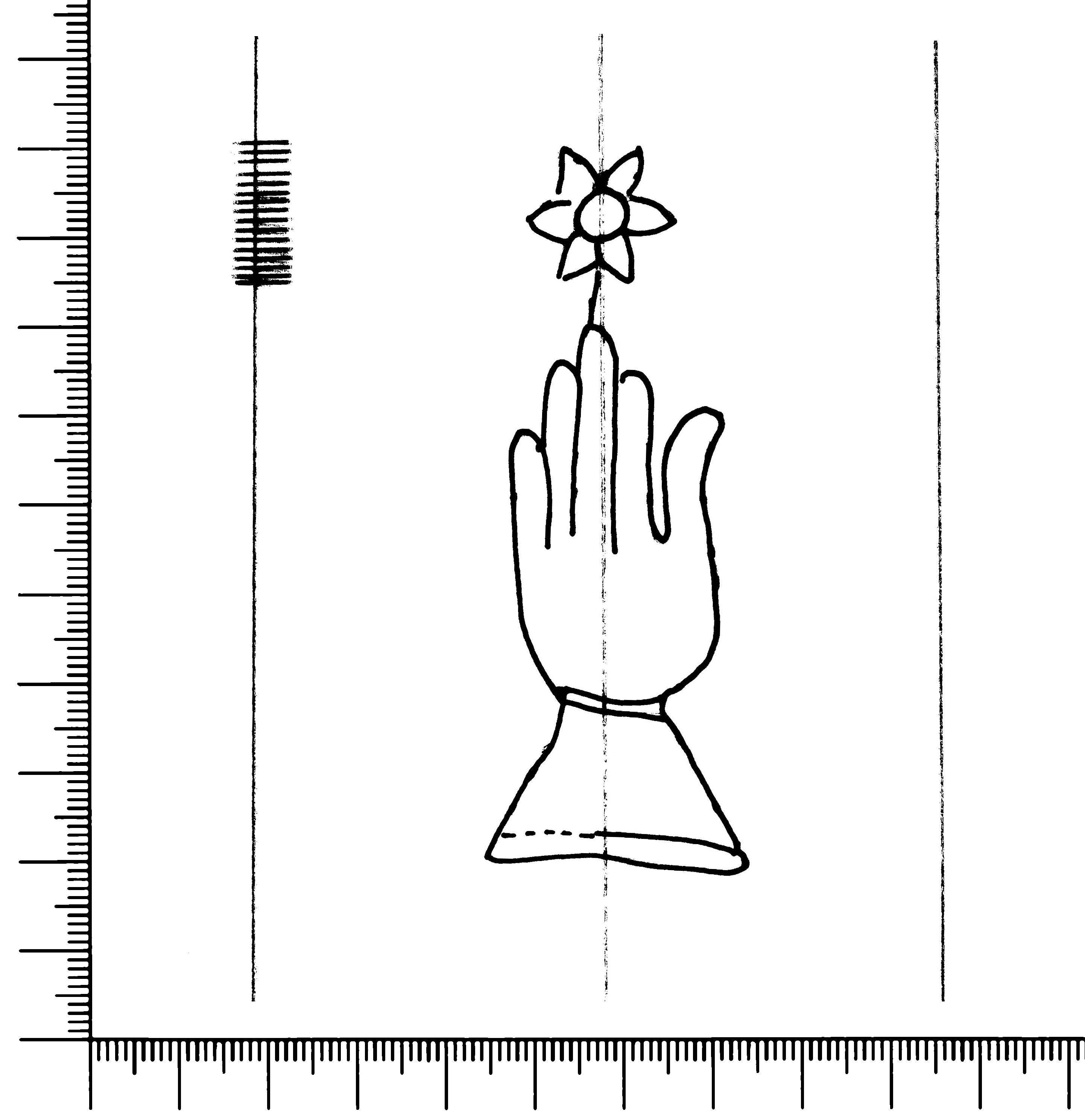 Tipo de filigrana: Sencilla Parte estudiada: Toda la filigrana Código del Motivo: B.02.02.03 Descripción: Mano con cuatro dedos juntos y pulgar separado. Encima flor de seis puntas. Estructura: Tradicional de líneas Altura (mm): 82 Anchura (mm): 30 Tipo de papel: Verjurado Posición en la hoja: Derecha centro Nº de corondeles en la hoja: 6 Distancia entre corondeles: Situada entre el corondel 4 y el corondel 6 Posición en relación al texto: Perpendicular al texto hacia abajo Origen de los datos: Datos obtenidos del original Información adicional: Se observan defectos o alteraciones del alambre en la huella dejada por la filigrana en el papel. Autor de los datos de este registro: María Dolores Díaz de Miranda Macías y Ana María Herrero Estado de la hoja: Cortado borde derecho Altura de la hoja: 311 Anchura de la hoja: 225 Color de la hoja: Natural Estado de conservación: Malo pH del papel: 7,09 Institución: Archivo de la Catedral de Oviedo.