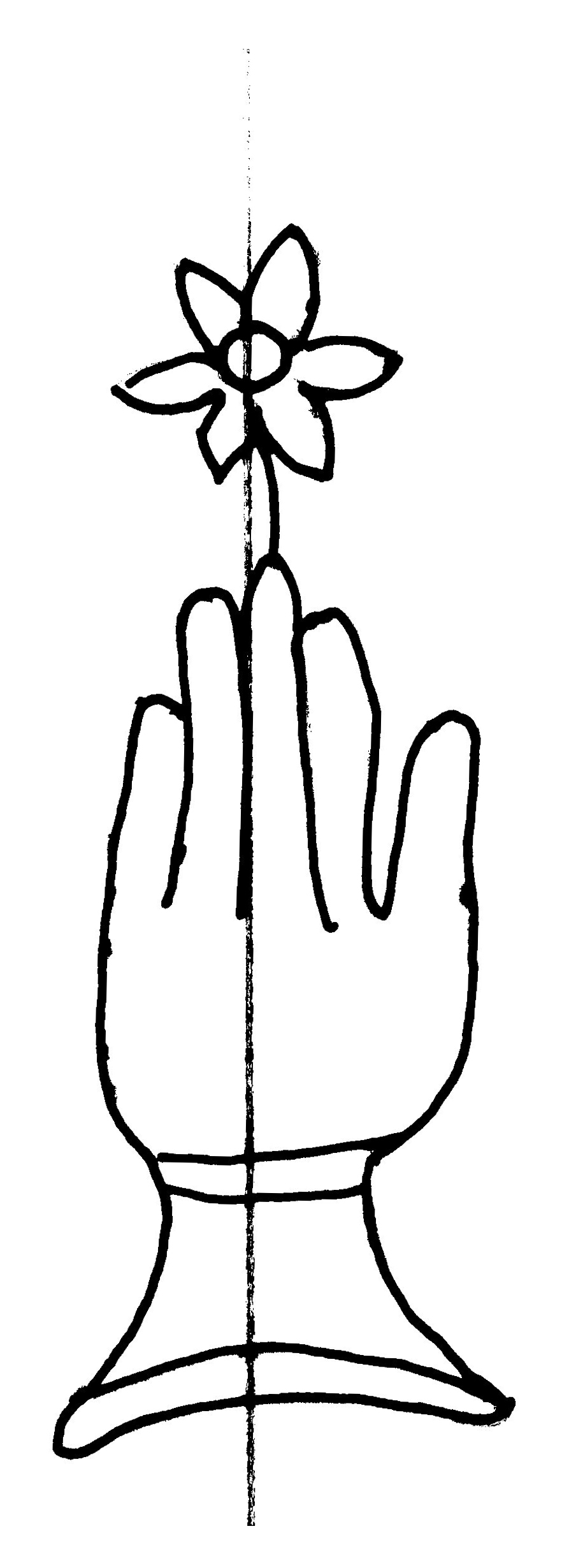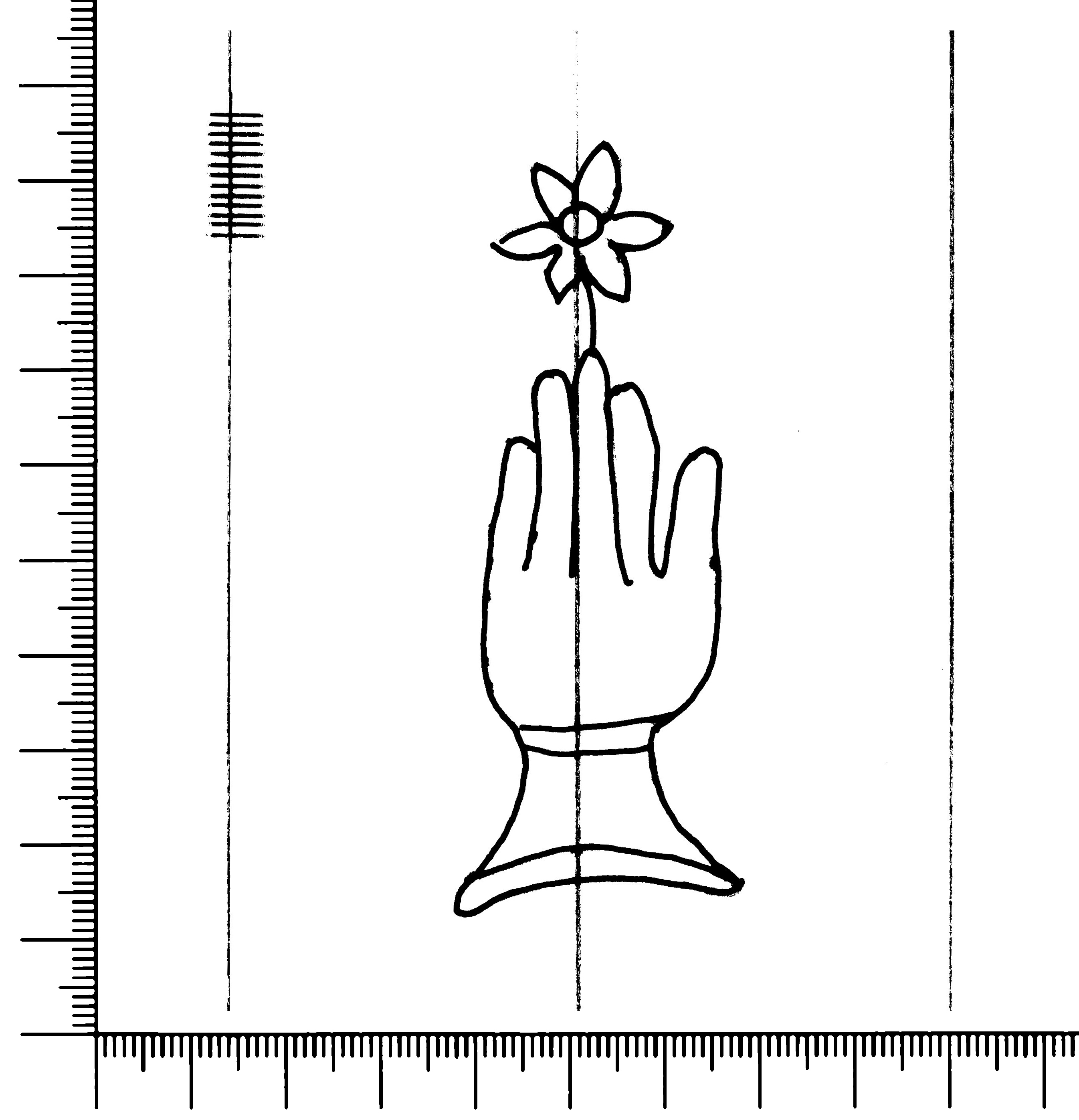 Tipo de filigrana: Sencilla Parte estudiada: Toda la filigrana Código del Motivo: B.02.02.03 Descripción: Mano con cuatro dedos juntos y pulgar separado. Encima flor de seis puntas. Estructura: Tradicional de líneas Altura (mm): 82 Anchura (mm): 30 Tipo de papel: Verjurado Posición en la hoja: Izquierda centro Nº de corondeles en la hoja: 6 Distancia entre corondeles: Situada entre el corondel 1 y el corondel 3 Posición en relación al texto: Perpendicular al texto hacia abajo Origen de los datos: Datos obtenidos del original Información adicional: Son visibles las puntadas que unen la filigrana a la verjura. Se acumula pulpa entre el corondel de apoyo y el borde externo de la hoja. Autor de los datos de este registro: María Dolores Díaz de Miranda Macías y Ana María Herrero Estado de la hoja: Cortado borde derecho e izquierdo Altura de la hoja: 313 Anchura de la hoja: 219 Color de la hoja: Natural Estado de conservación: Malo pH del papel: 7,26 Institución: Archivo de la Catedral de Oviedo.