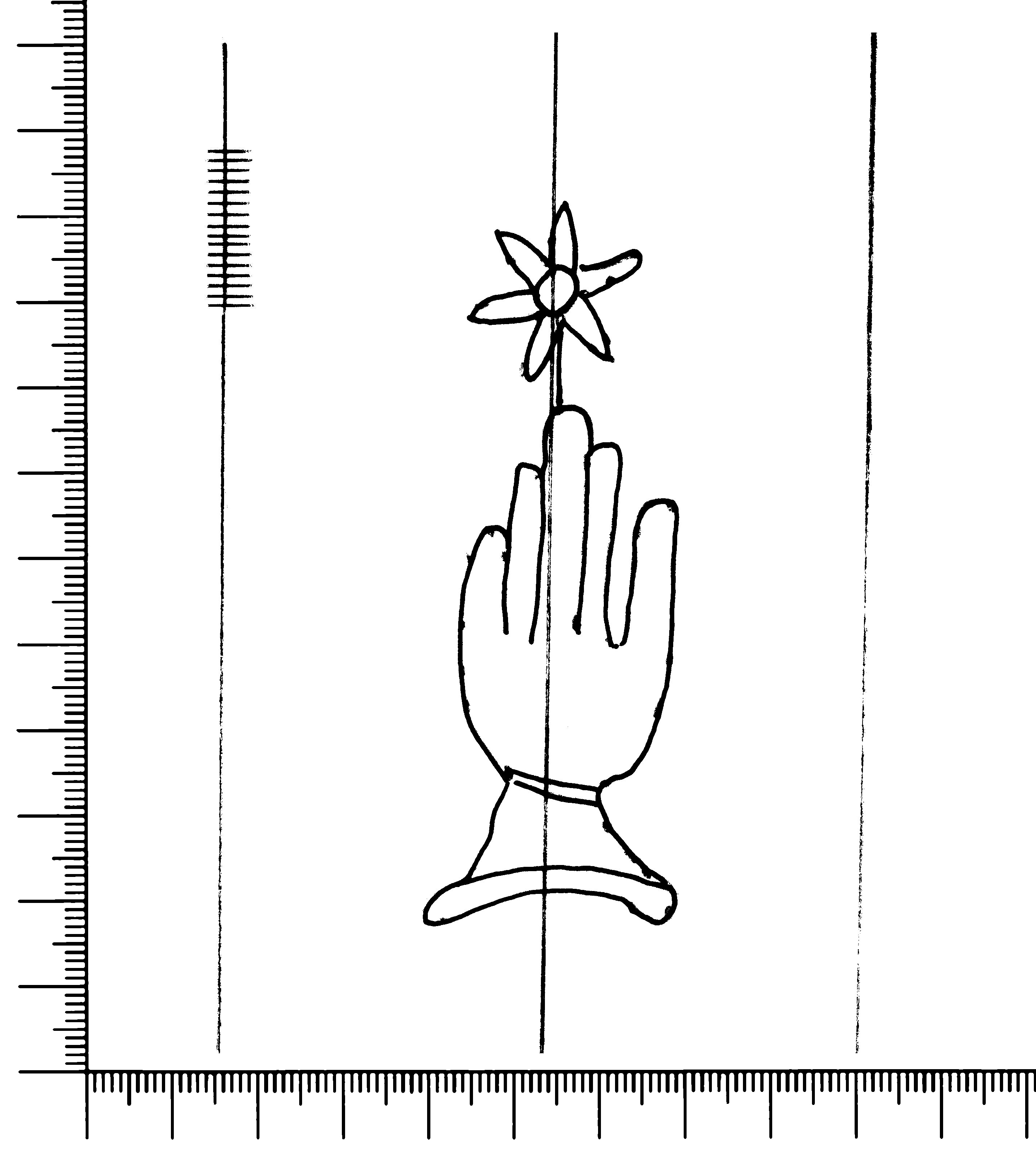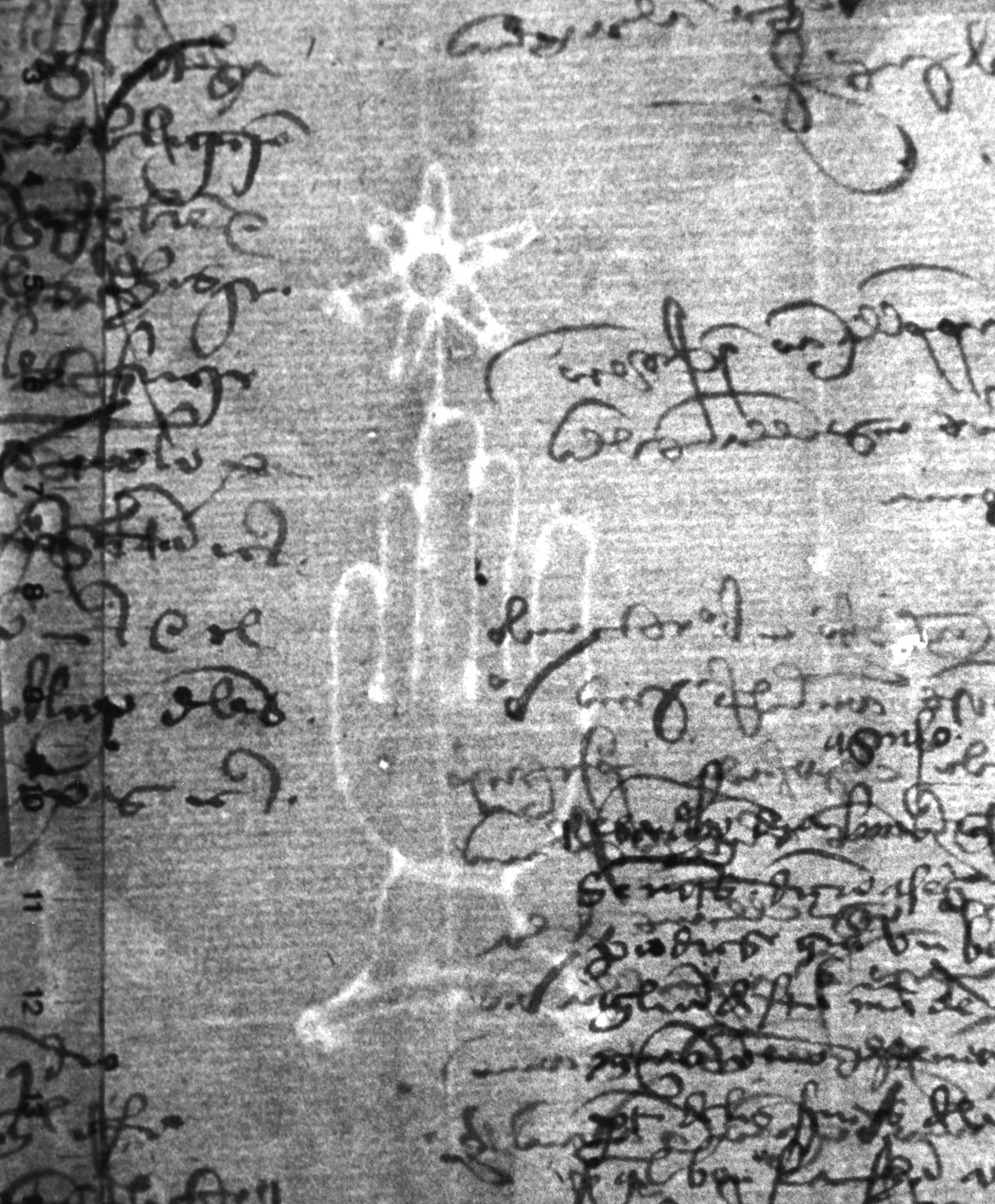 Tipo de filigrana: Sencilla Parte estudiada: Toda la filigrana Código del Motivo: B.02.02.03 Descripción: Mano con cuatro dedos juntos y pulgar separado. Encima flor de seis puntas. Estructura: Tradicional de líneas Altura (mm): 86 Anchura (mm): 30 Tipo de papel: Verjurado Posición en la hoja: Medio centro Nº de corondeles en la hoja: 6 Distancia entre corondeles: Situada entre el corondel 2 y el corondel 4 Posición en relación al texto: Perpendicular al texto hacia arriba Origen de los datos: Datos obtenidos del original Información adicional: Son visibles las puntadas que unen la filigrana a la verjura. Autor de los datos de este registro: María Dolores Díaz de Miranda Macías y Ana María Herrero Estado de la hoja: Cortado borde derecho e izquierdo Altura de la hoja: 312 Anchura de la hoja: 220 Color de la hoja: Natural Estado de conservación: Bueno pH del papel: 6,90 Institución: Archivo de la Catedral de Oviedo.