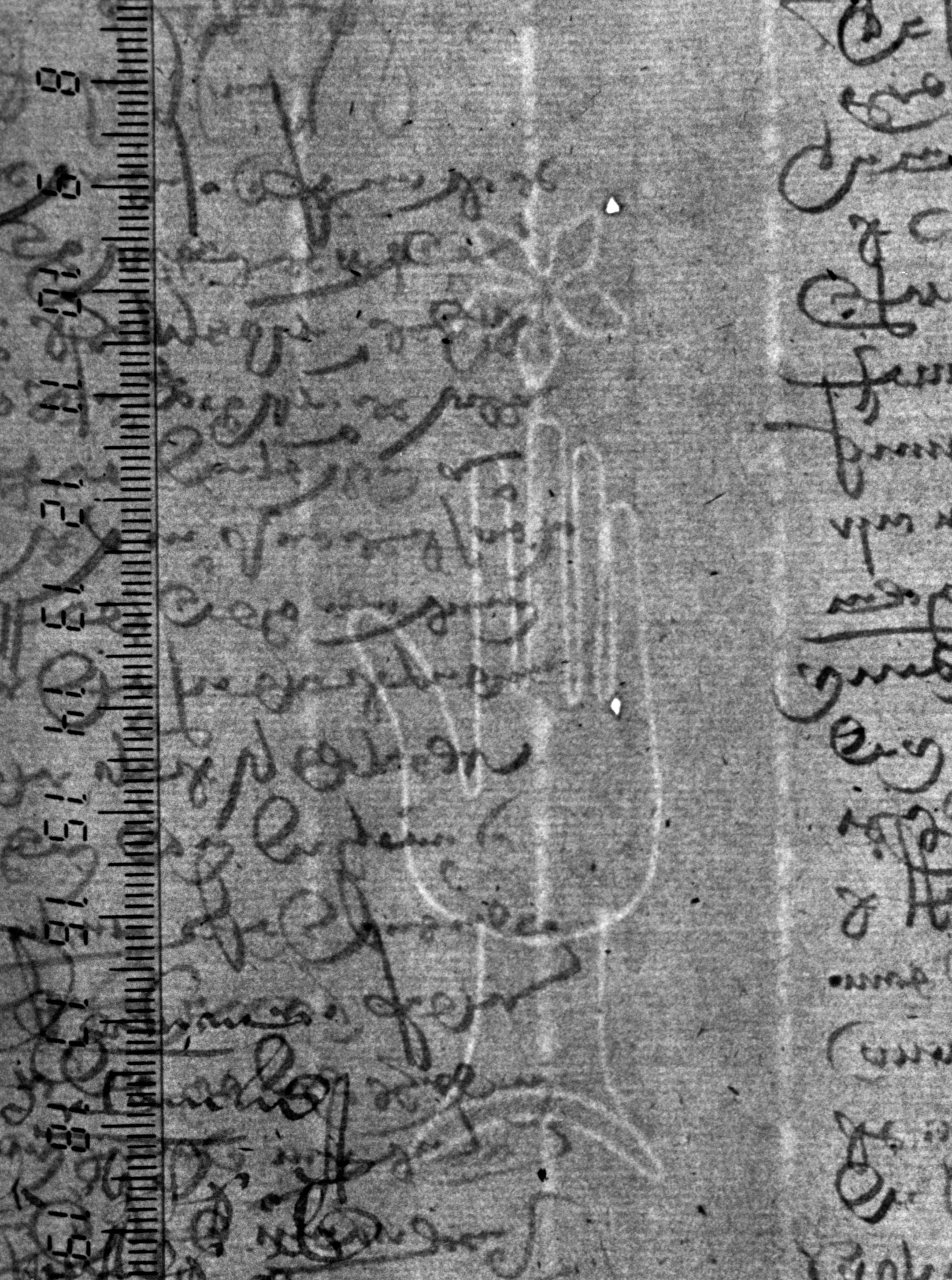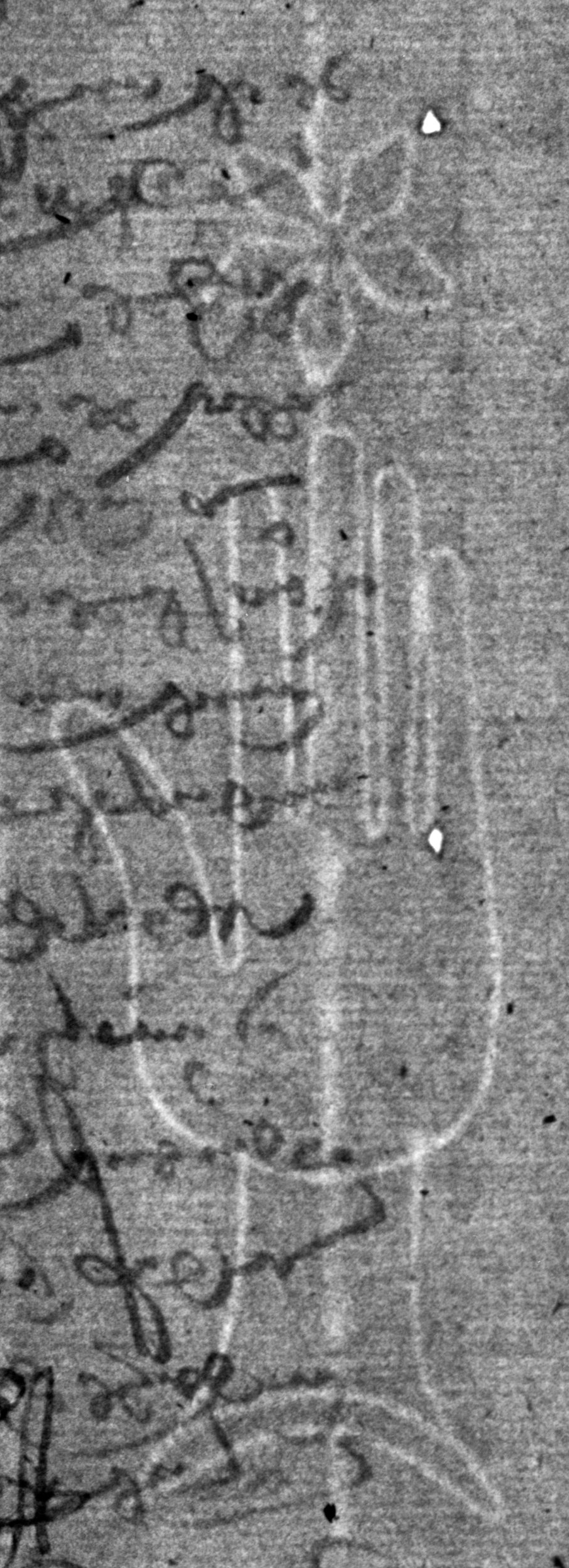 Tipo de filigrana: Sencilla Parte estudiada: Toda la filigrana Código del Motivo: B.02.02.03 Descripción: Mano con cuatro dedos juntos y pulgar separado. Encima flor de seis puntas. Estructura: Tradicional de líneas Altura (mm): 94 Anchura (mm): 29 Tipo de papel: Verjurado Posición en la hoja: Medio centro Nº de corondeles en la hoja: 8 Distancia entre corondeles: Situada entre el corondel 3 y el corondel 5 Posición en relación al texto: Perpendicular al texto hacia abajo Origen de los datos: Datos obtenidos del original Información adicional: Son visibles las puntadas que unen la filigrana a la verjura. Los corondeles son muy gruesos. Autor de los datos de este registro: María Dolores Díaz de Miranda Macías y Ana María Herrero Estado de la hoja: Cortado borde izquierdo Altura de la hoja: 305 Anchura de la hoja: 218 Color de la hoja: Natural Estado de conservación: Bueno pH del papel: 6,41 Institución: Archivo de la Catedral de Oviedo.