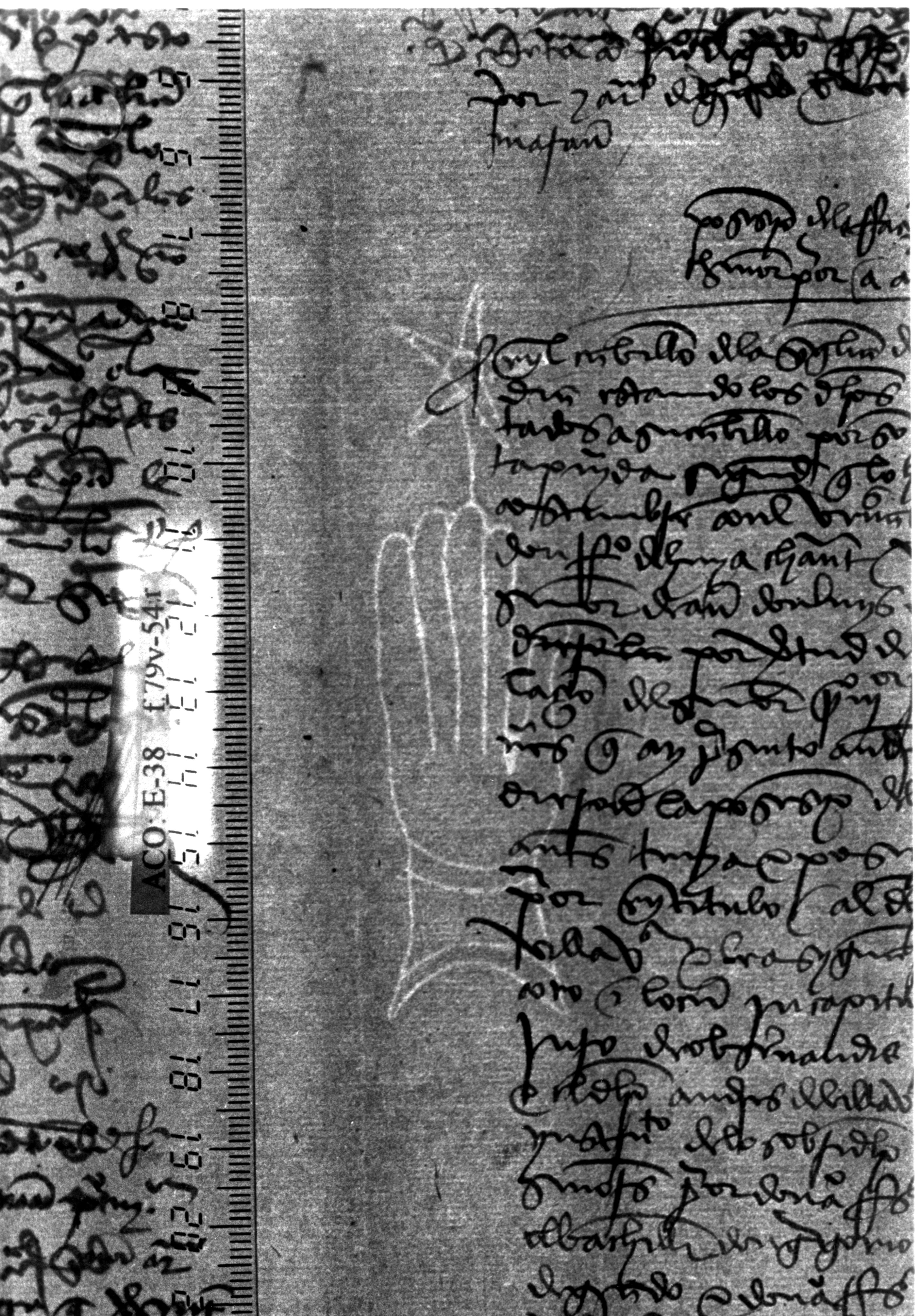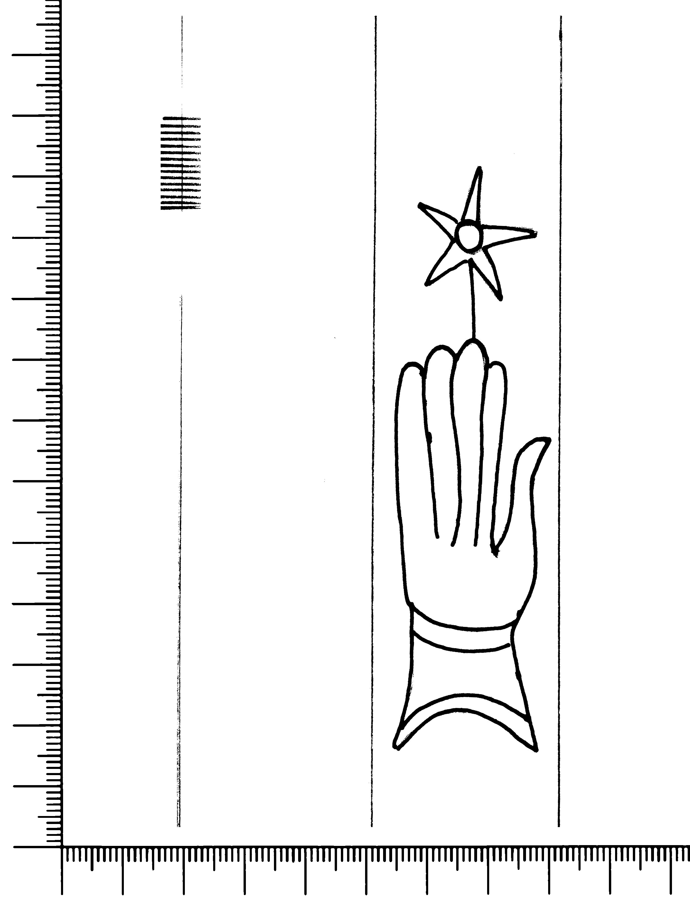 Tipo de filigrana: Sencilla Parte estudiada: Toda la filigrana Código del Motivo: B.02.02.02 Descripción: Mano con cuatro dedos juntos y pulgar separado. Encima flor de seis puntas Estructura: Tradicional de líneas Altura (mm): 98 Anchura (mm): 26 Tipo de papel: Verjurado Posición en la hoja: Medio centro Nº de corondeles en la hoja: 7 Distancia entre corondeles: Situada entre el corondel 4 y el corondel 5 Posición en relación al texto: Perpendicular al texto hacia arriba Origen de los datos: Datos obtenidos del original Información adicional: Son visibles las puntadas que unen la filigrana a la verjura. Se ven muy mal los corondeles. Se acumula pulpa entre el corondel de apoyo y el borde externo de la hoja. Autor de los datos de este registro: María Dolores Díaz de Miranda Macías y Ana María Herrero Estado de la hoja: Cortado borde derecho Altura de la hoja: 307 Anchura de la hoja: 220 Color de la hoja: Natural Estado de conservación: Bueno pH del papel: 5,30 Institución: Archivo de la Catedral de Oviedo.