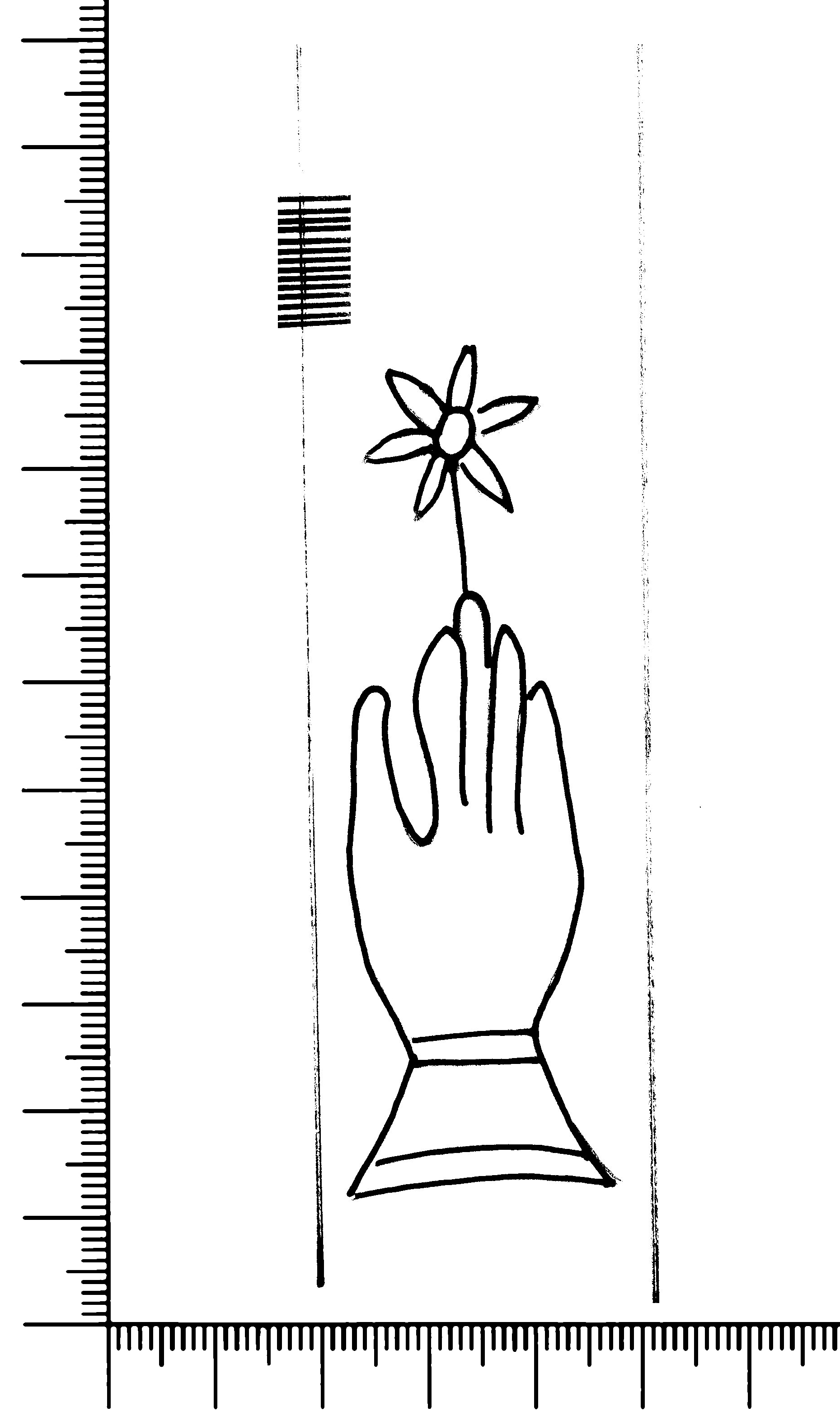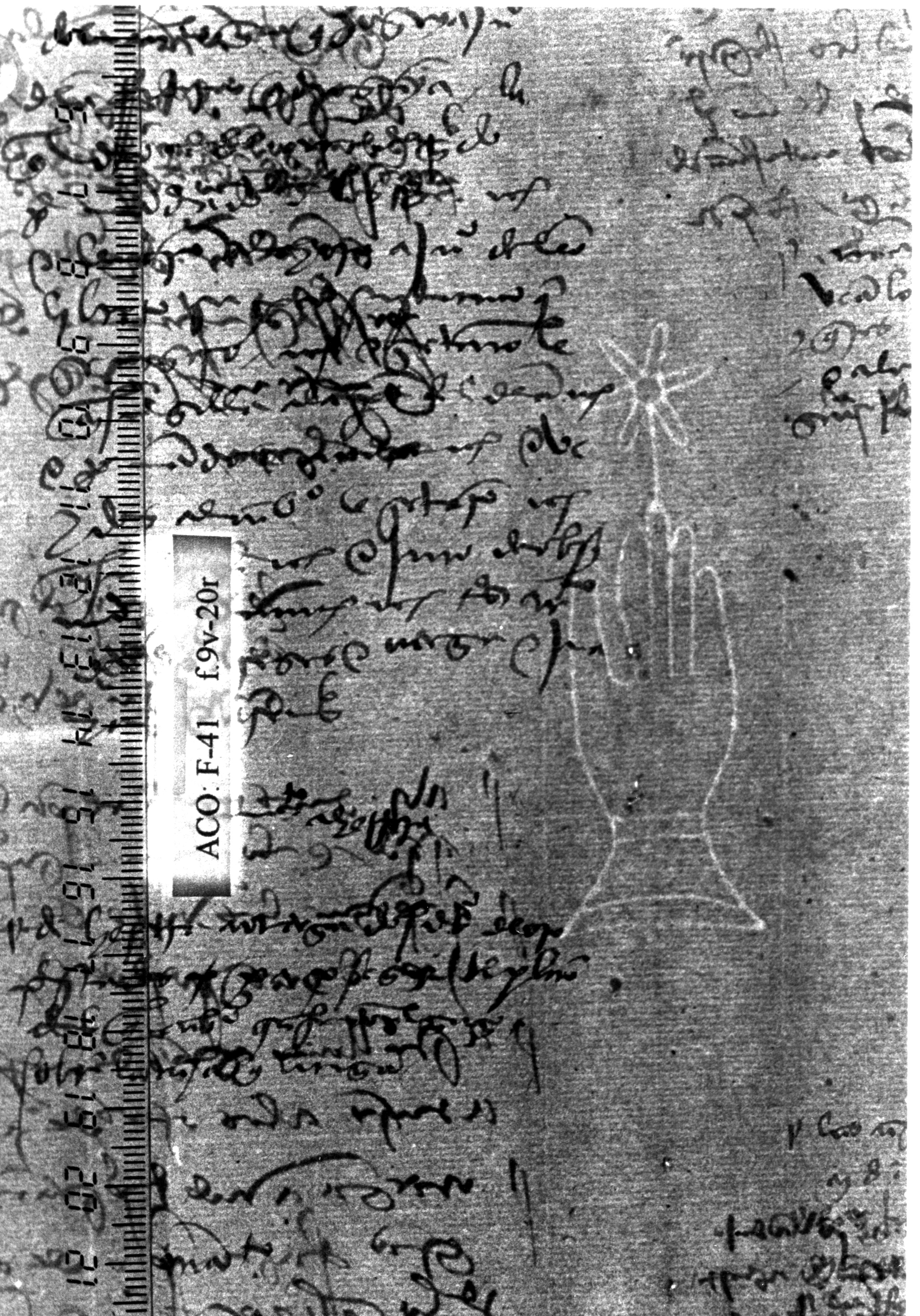 Tipo de filigrana: Sencilla Parte estudiada: Toda la filigrana Código del Motivo: B.02.02.03 Descripción: Mano con cuatro dedos juntos y pulgar separado. Encima flor de seis puntas Estructura: Tradicional de líneas Altura (mm): 81 Anchura (mm): 27 Tipo de papel: Verjurado Posición en la hoja: Medio centro Nº de corondeles en la hoja: 8 Distancia entre corondeles: Situada entre el corondel 4 y el corondel 5 Posición en relación al texto: Perpendicular al texto hacia arriba Origen de los datos: Datos obtenidos del original Información adicional: Son visibles las puntadas que unen la filigrana a la verjura. Se acumula pulpa entre el corondel de apoyo y el borde externo de la hoja. Se ven bastante mal los puntizones. Tienen una huella muy fina, tanto los corondeles como los puntizones. Autor de los datos de este registro: María Dolores Díaz de Miranda Macías y Ana María Herrero Estado de la hoja: Cortado borde derecho Altura de la hoja: 311 Anchura de la hoja: 216 Color de la hoja: Natural Estado de conservación: Bueno pH del papel: 6,40 Institución: Archivo de la Catedral de Oviedo.