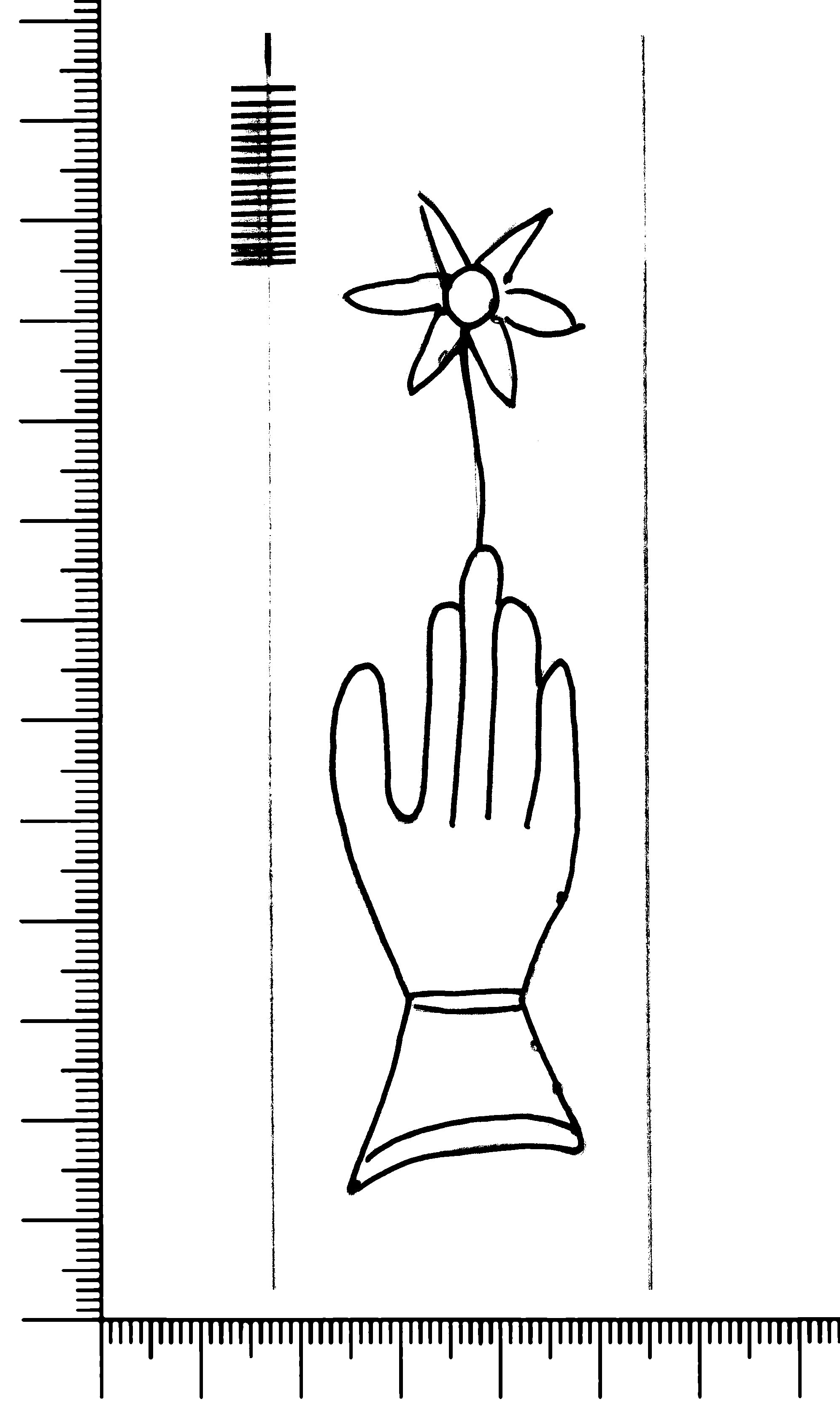 Tipo de filigrana: Sencilla Parte estudiada: Toda la filigrana Código del Motivo: B.02.02.03 Descripción: Mano con cuatro dedos juntos y pulgar separado. Encima flor de seis puntas Estructura: Tradicional de líneas Altura (mm): 101 Anchura (mm): 27 Tipo de papel: Verjurado Posición en la hoja: Medio centro Nº de corondeles en la hoja: 6 Distancia entre corondeles: Situada entre el corondel 2 y el corondel 3 Posición en relación al texto: Perpendicular al texto hacia arriba Origen de los datos: Datos obtenidos del original Información adicional: Son visibles las puntadas que unen la filigrana a la verjura. Autor de los datos de este registro: María Dolores Díaz de Miranda Macías y Ana María Herrero Estado de la hoja: Cortado borde izquierdo Altura de la hoja: 310 Anchura de la hoja: 226 Color de la hoja: Natural Estado de conservación: Malo pH del papel: 7,43 7,29 7,79 (oscila con varias medidas) Institución: Archivo de la Catedral de Oviedo.