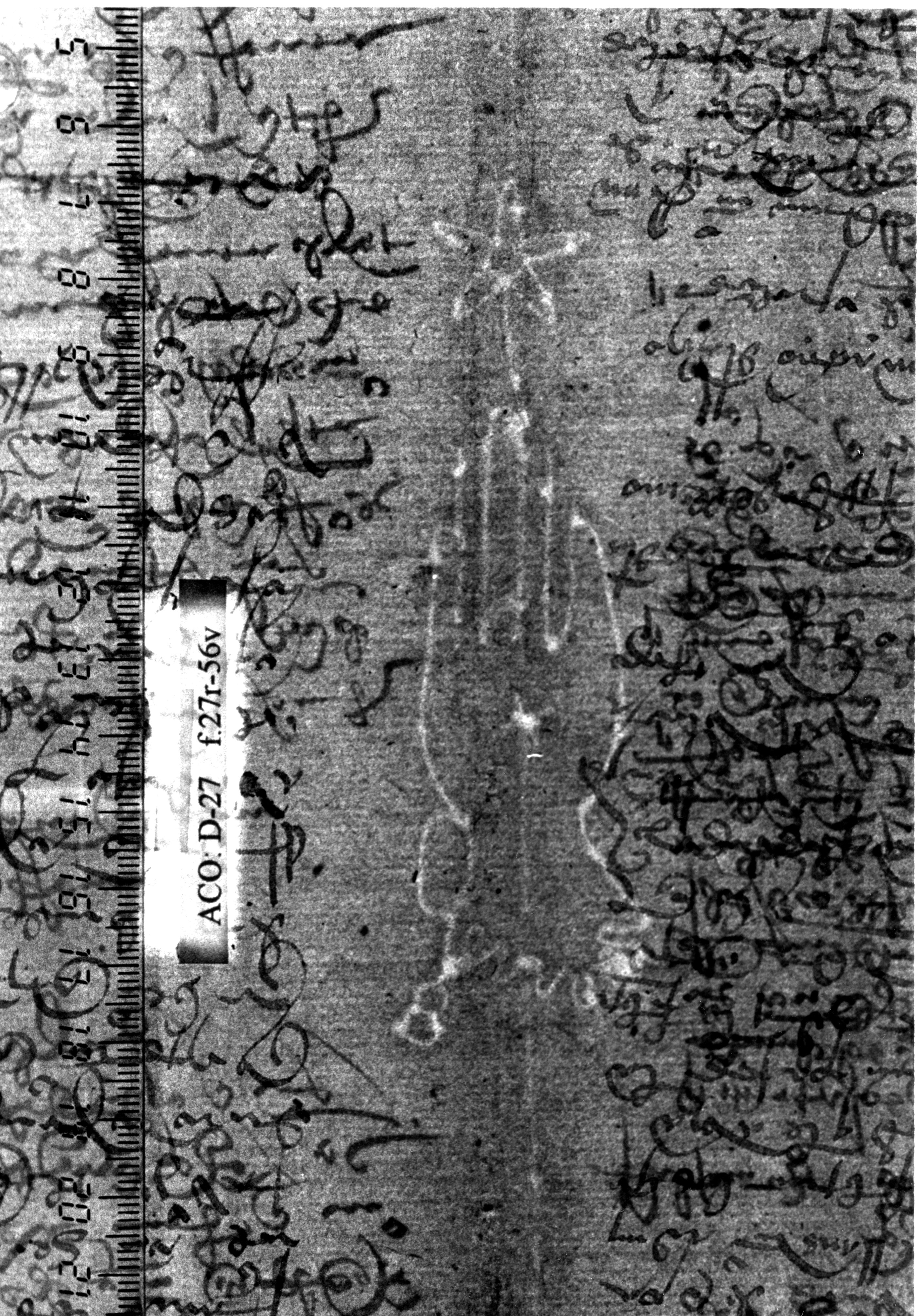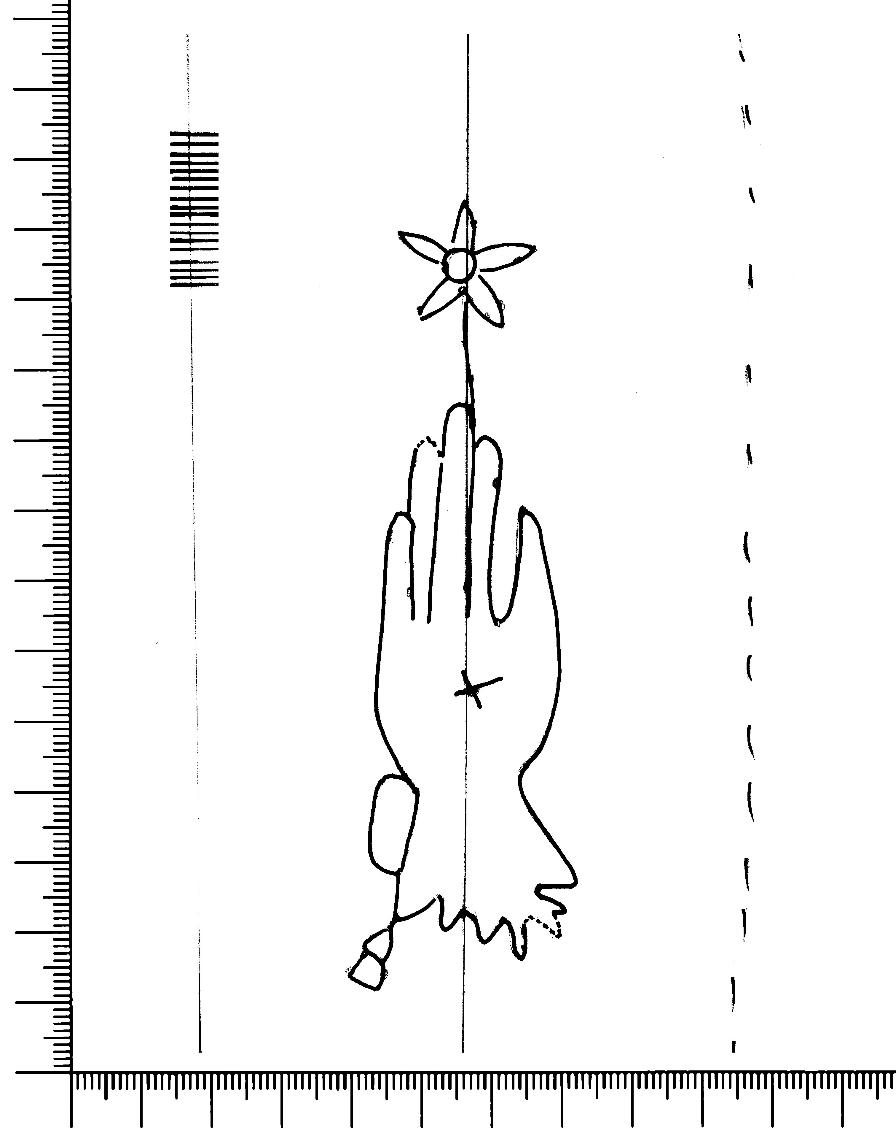 Tipo de filigrana: Sencilla Parte estudiada: Toda la filigrana Código del Motivo: B.02.07.03 Descripción: Mano con cuatro dedos juntos y pulgar separado. Con puño festoneado y encima flor de seis puntas y en el interior una cruz en aspa Estructura: Tradicional de líneas Altura (mm): 97 Anchura (mm): 33 Tipo de papel: Verjurado Posición en la hoja: Medio centro Nº de corondeles en la hoja: 6 Distancia entre corondeles: Situada entre el corondel 2 y el corondel 4 Posición en relación al texto: Perpendicular al texto hacia abajo Origen de los datos: Datos obtenidos del original Información adicional: Son visibles las puntadas que unen la filigrana a la verjura. Se ven muy mal los corondeles, sobre todo el corondel de apoyo. Autor de los datos de este registro: María Dolores Díaz de Miranda Macías y Ana María Herrero Estado de la hoja: Cortado borde izquierdo Altura de la hoja: 312 Anchura de la hoja: 223 Color de la hoja: Natural Estado de conservación: Malo pH del papel: 7,20 6,98 7,30 (oscila con varias mediciones) Institución: Archivo de la Catedral de Oviedo.