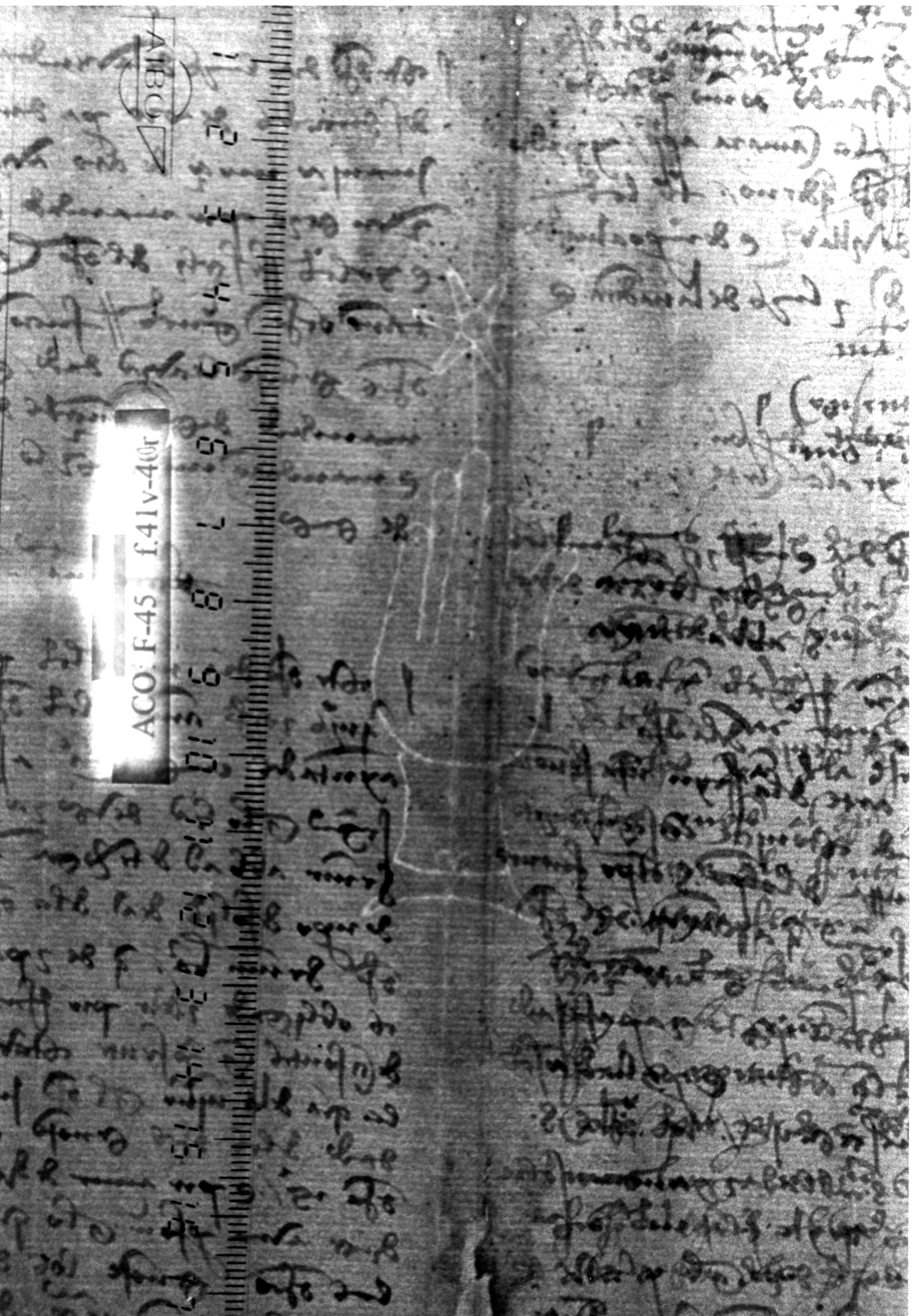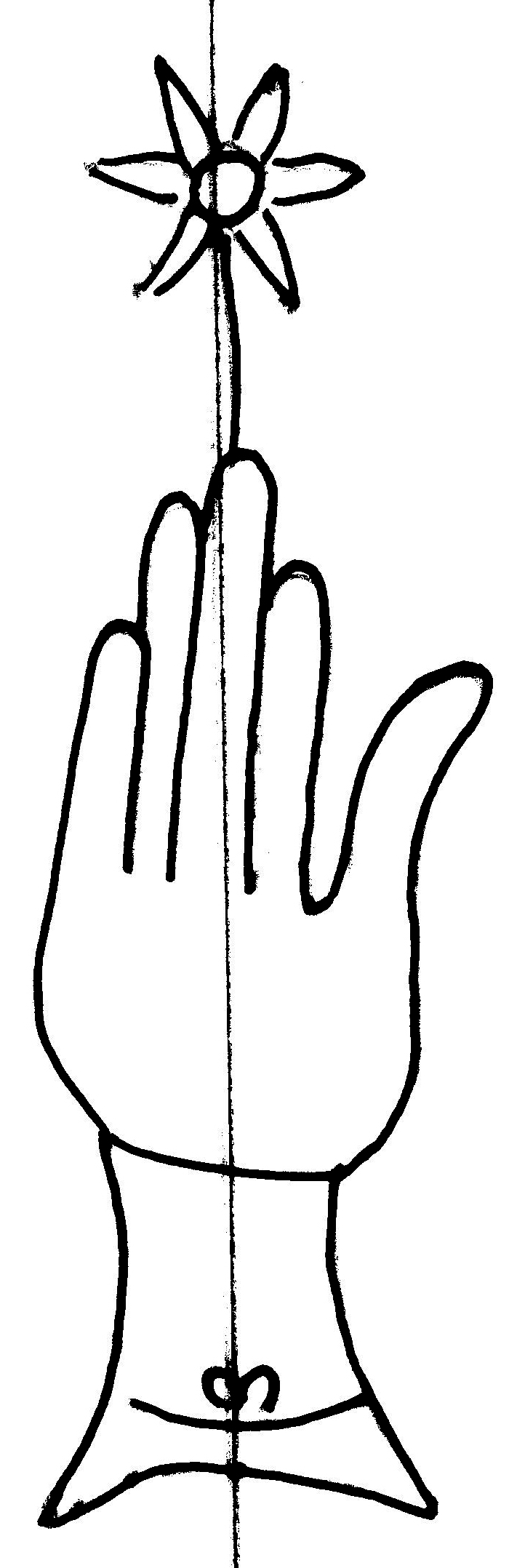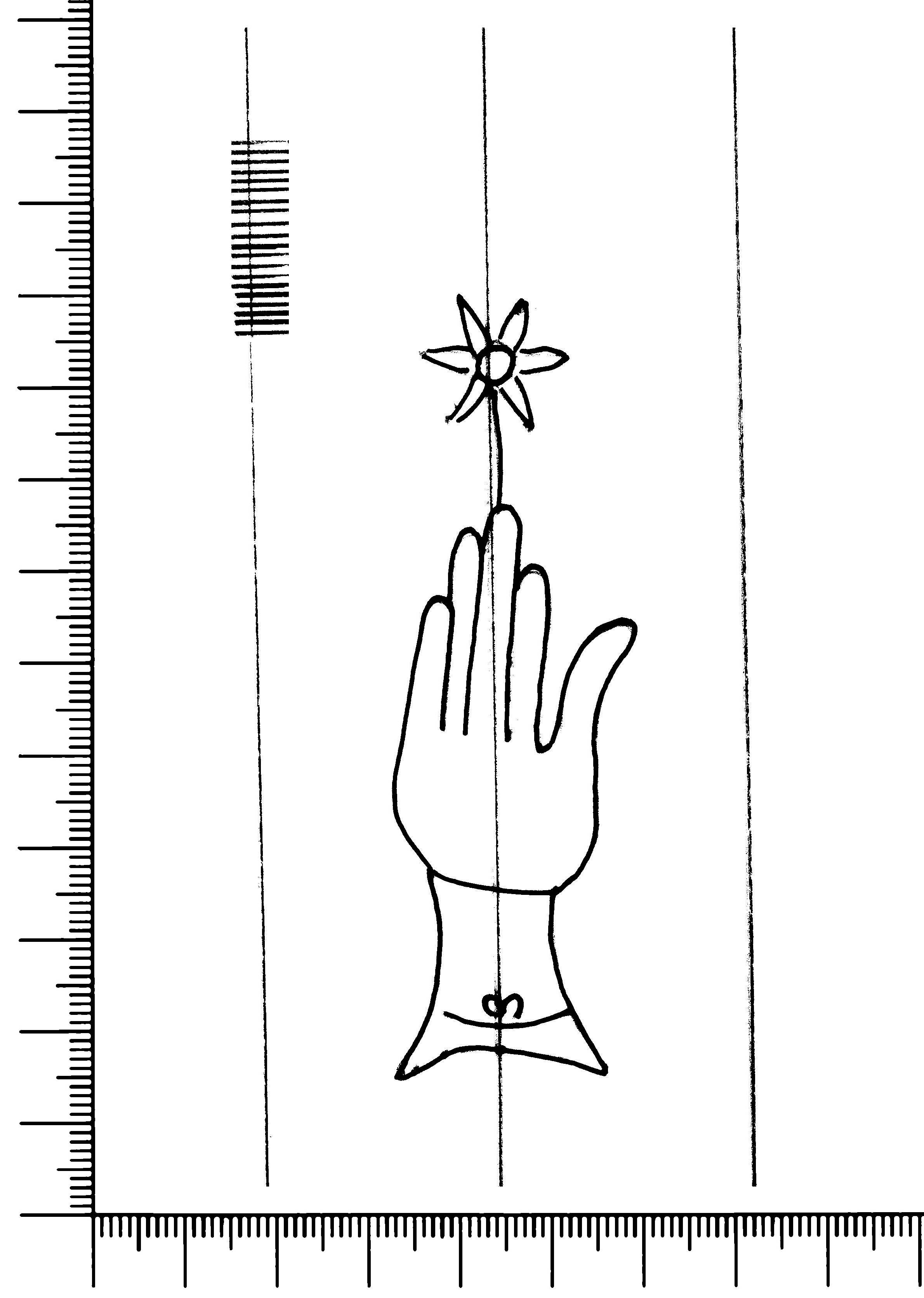 Tipo de filigrana: Sencilla Parte estudiada: Toda la filigrana Código del Motivo: B.02.03.00 Descripción: Mano con cuatro dedos juntos y pulgar separado. Con las uñas marcadas. Encima flor de seis punta. Dentro del manguito un ocho en horizontal Estructura: Tradicional de líneas Altura (mm): 85 Anchura (mm): 27 Tipo de papel: Verjurado Posición en la hoja: Medio centro Nº de corondeles en la hoja: 9 Distancia entre corondeles: Situada entre el corondel 3 y el corondel 5 Posición en relación al texto: Perpendicular al texto hacia arriba Origen de los datos: Datos obtenidos del original Información adicional: Son visibles las puntadas que unen la filigrana a la verjura. El corondel de apoyo está muy próximo al borde externo de la hoja (3 mm). Se acumula pulpa entre el corondel de apoyo y el borde externo de la hoja. Autor de los datos de este registro: María Dolores Díaz de Miranda Macías y Ana María Herrero Estado de la hoja: Cortado borde izquierdo Altura de la hoja: 294 Anchura de la hoja: 221 Color de la hoja: Natural Estado de conservación: Regular pH del papel: 6,40 (oscila) Institución: Archivo de la Catedral de Oviedo.