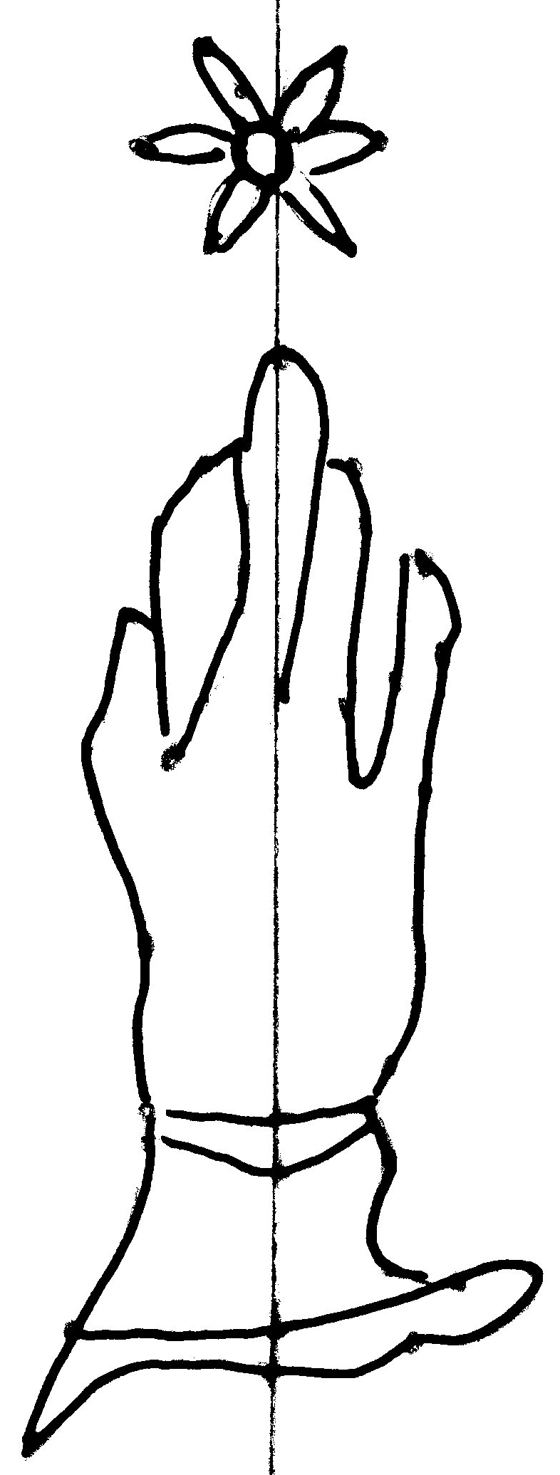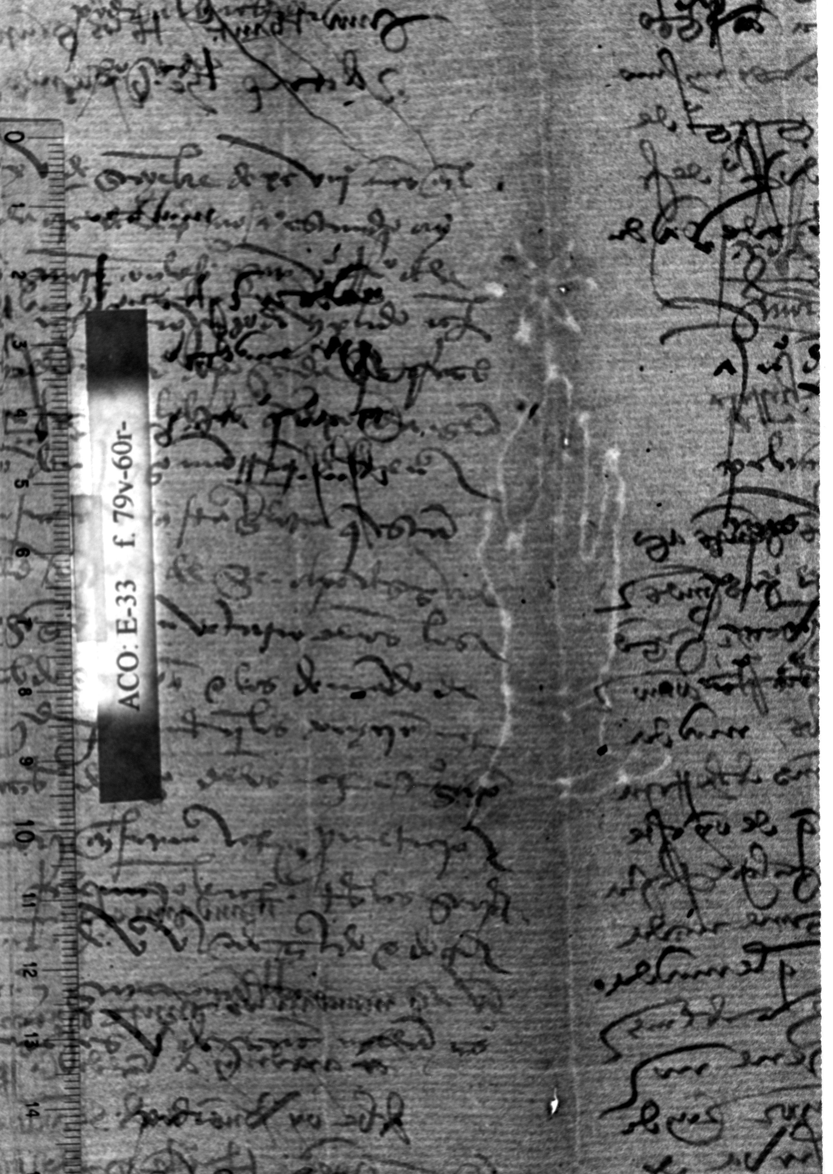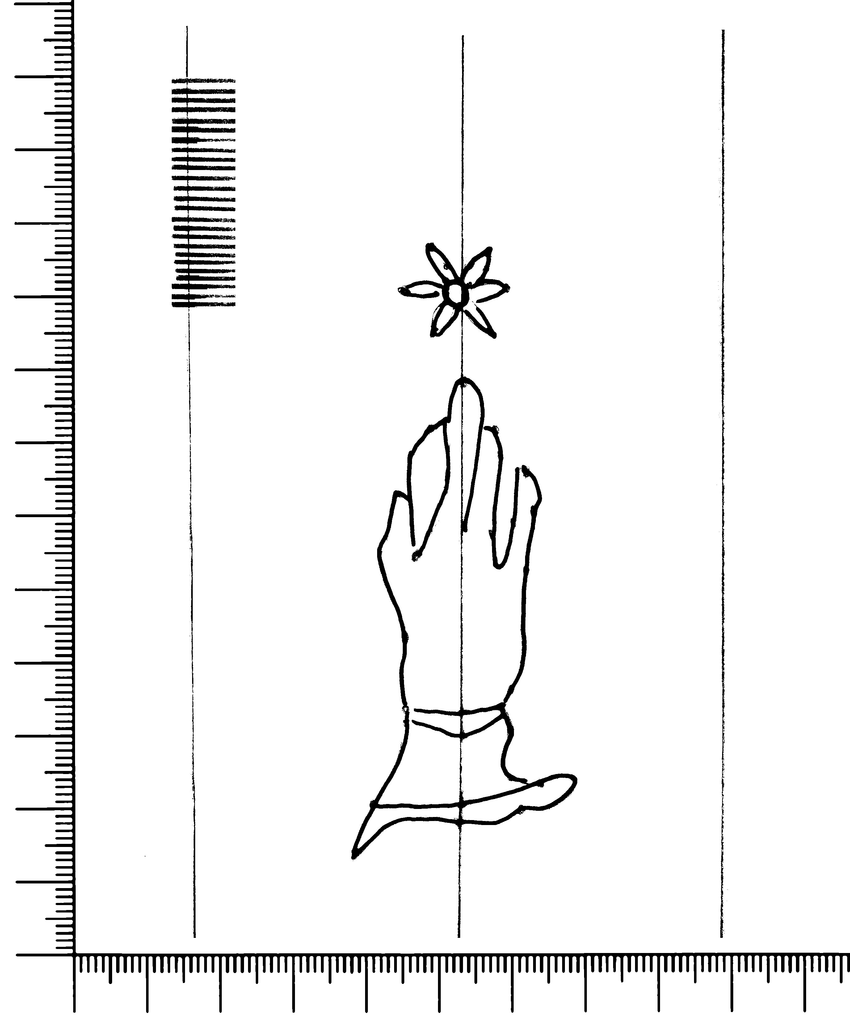 Tipo de filigrana: Sencilla Parte estudiada: Toda la filigrana Código del Motivo: B.02.02.03 Descripción: Mano con cuatro dedos juntos y pulgar separado. Encima flor de seis puntas Estructura: Tradicional de líneas Altura (mm): 84 Anchura (mm): 30 Tipo de papel: Verjurado Posición en la hoja: Medio centro Nº de corondeles en la hoja: 5 Distancia entre corondeles: Situada entre el corondel 2 y el corondel 4 Posición en relación al texto: Perpendicular al texto hacia arriba Origen de los datos: Datos obtenidos del original Información adicional: Son visibles las puntadas que unen la filigrana a la verjura. Se observan defectos o alteraciones del alambre en la huella dejada por la filigrana en el papel. No se distingue el corondel de apoyo (parece que no hay). Autor de los datos de este registro: María Dolores Díaz de Miranda Macías y Ana María Herrero Estado de la hoja: Cortado borde derecho Altura de la hoja: 310 Anchura de la hoja: 220 Color de la hoja: Natural Estado de conservación: Bueno pH del papel: 6,49 (oscila) Institución: Archivo de la Catedral de Oviedo.