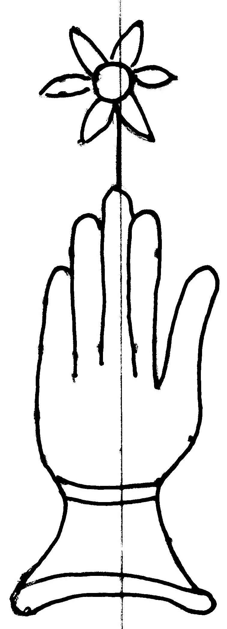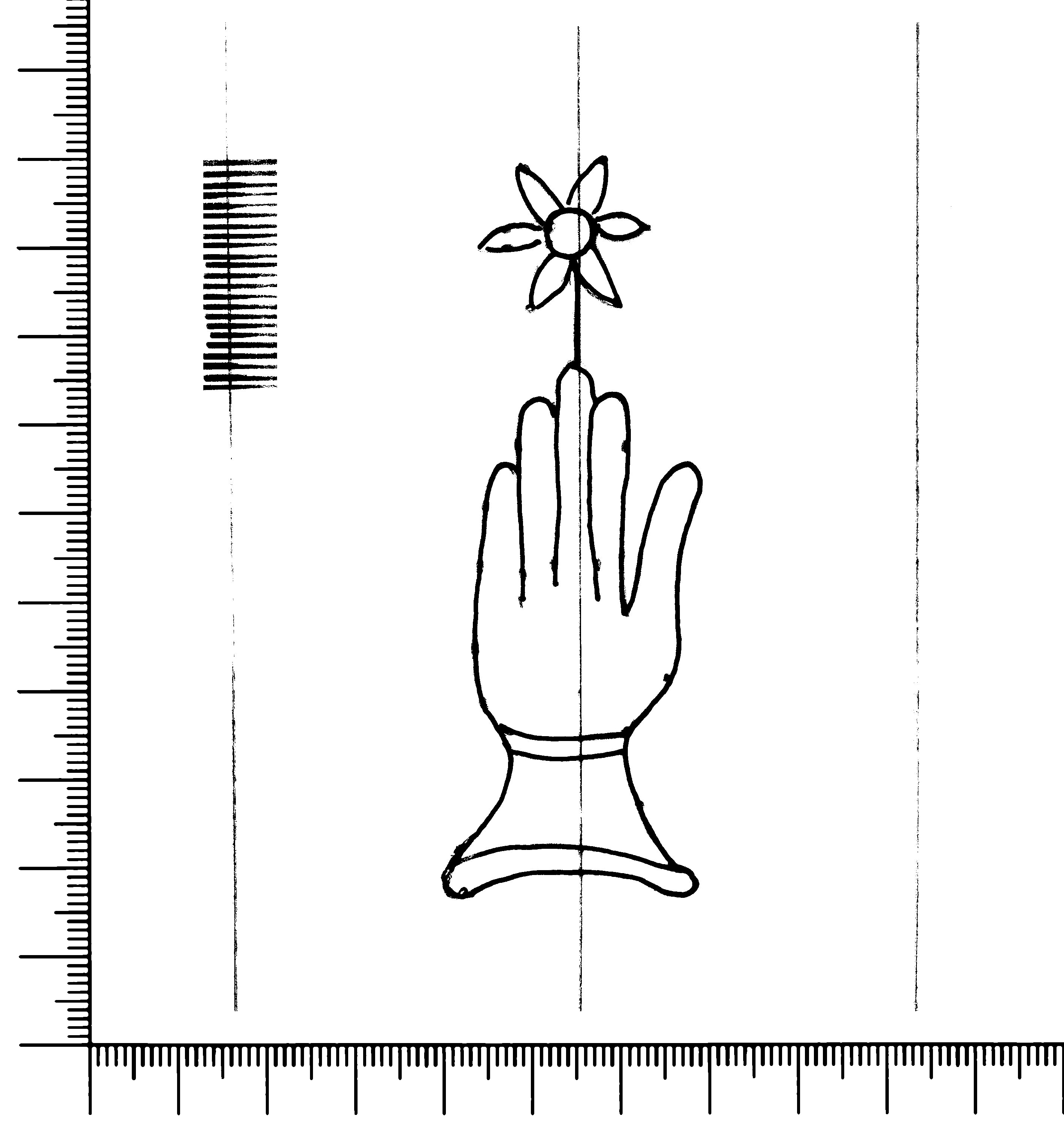 Tipo de filigrana: Sencilla Parte estudiada: Toda la filigrana Código del Motivo: B.02.02.03 Descripción: Mano con cuatro dedos juntos y pulgar separado. Encima flor de seis puntas Estructura: Tradicional de líneas Altura (mm): 84 Anchura (mm): 30 Tipo de papel: Verjurado Posición en la hoja: Derecha centro Nº de corondeles en la hoja: 6 Distancia entre corondeles: Situada entre el corondel 4 y el corondel 6 Posición en relación al texto: Perpendicular al texto hacia abajo Origen de los datos: Datos obtenidos del original Información adicional: Son visibles las puntadas que unen la filigrana a la verjura. Se acumula pulpa entre el corondel de apoyo y el borde externo de la hoja. No se distingue si hay zonas de sombra en el corondel de apoyo y el corondel portador. El corondel de apoyo es más grueso que los demás corondeles. Autor de los datos de este registro: María Dolores Díaz de Miranda Macías y Ana María Herrero Estado de la hoja: Cortado borde derecho Altura de la hoja: 313 Anchura de la hoja: 222 Color de la hoja: Natural Estado de conservación: Bueno pH del papel: 6,83 (oscila) Institución: Archivo de la Catedral de Oviedo.