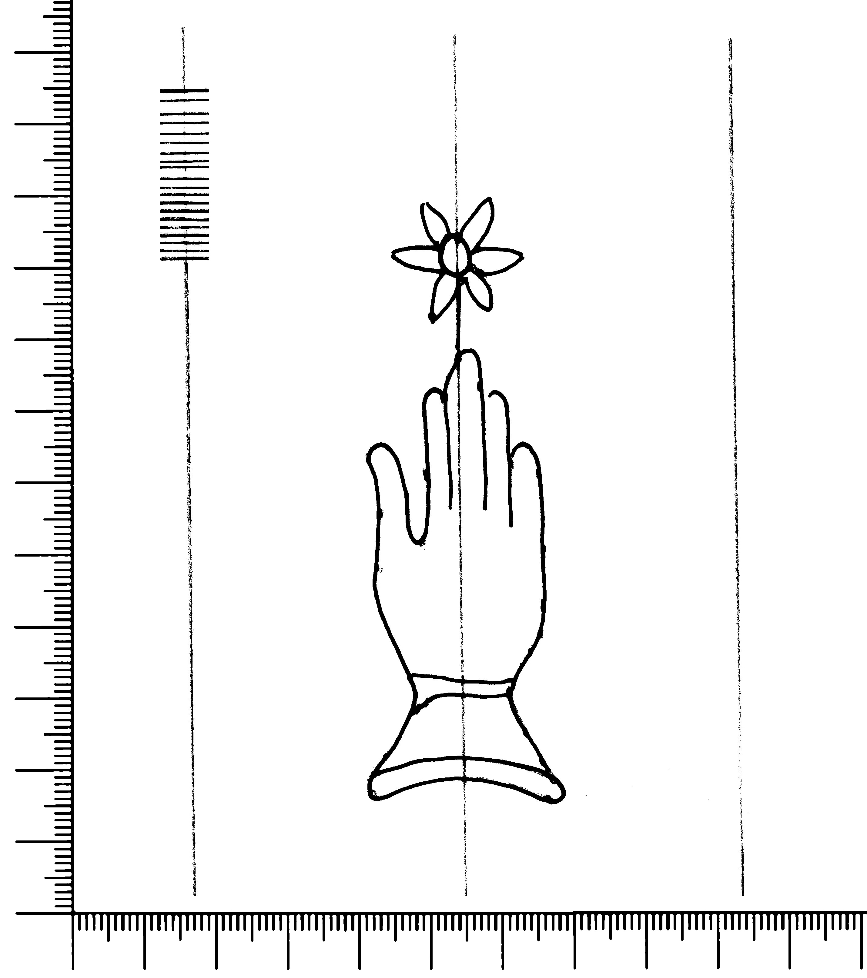 Tipo de filigrana: Sencilla Parte estudiada: Toda la filigrana Código del Motivo: B.02.02.03 Descripción: Mano con cuatro dedos juntos y pulgar separado. Encima flor de seis puntas Estructura: Tradicional de líneas Altura (mm): 85 Anchura (mm): 29 Tipo de papel: Verjurado Posición en la hoja: Izquierda centro Nº de corondeles en la hoja: 6 Distancia entre corondeles: Situada entre el corondel 1 y el corondel 3 Posición en relación al texto: Perpendicular al texto hacia abajo Origen de los datos: Datos obtenidos del original Información adicional: Son visibles las puntadas que unen la filigrana a la verjura. El corondel de apoyo es más grueso que los demás corondeles. Se acumula pulpa entre el corondel de apoyo y el borde externo de la hoja. Autor de los datos de este registro: María Dolores Díaz de Miranda Macías y Ana María Herrero Estado de la hoja: Cortado borde izquierdo Altura de la hoja: 311 Anchura de la hoja: 216 Color de la hoja: Natural Estado de conservación: Regular pH del papel: 6,52 (oscila) Institución: Archivo de la Catedral de Oviedo.