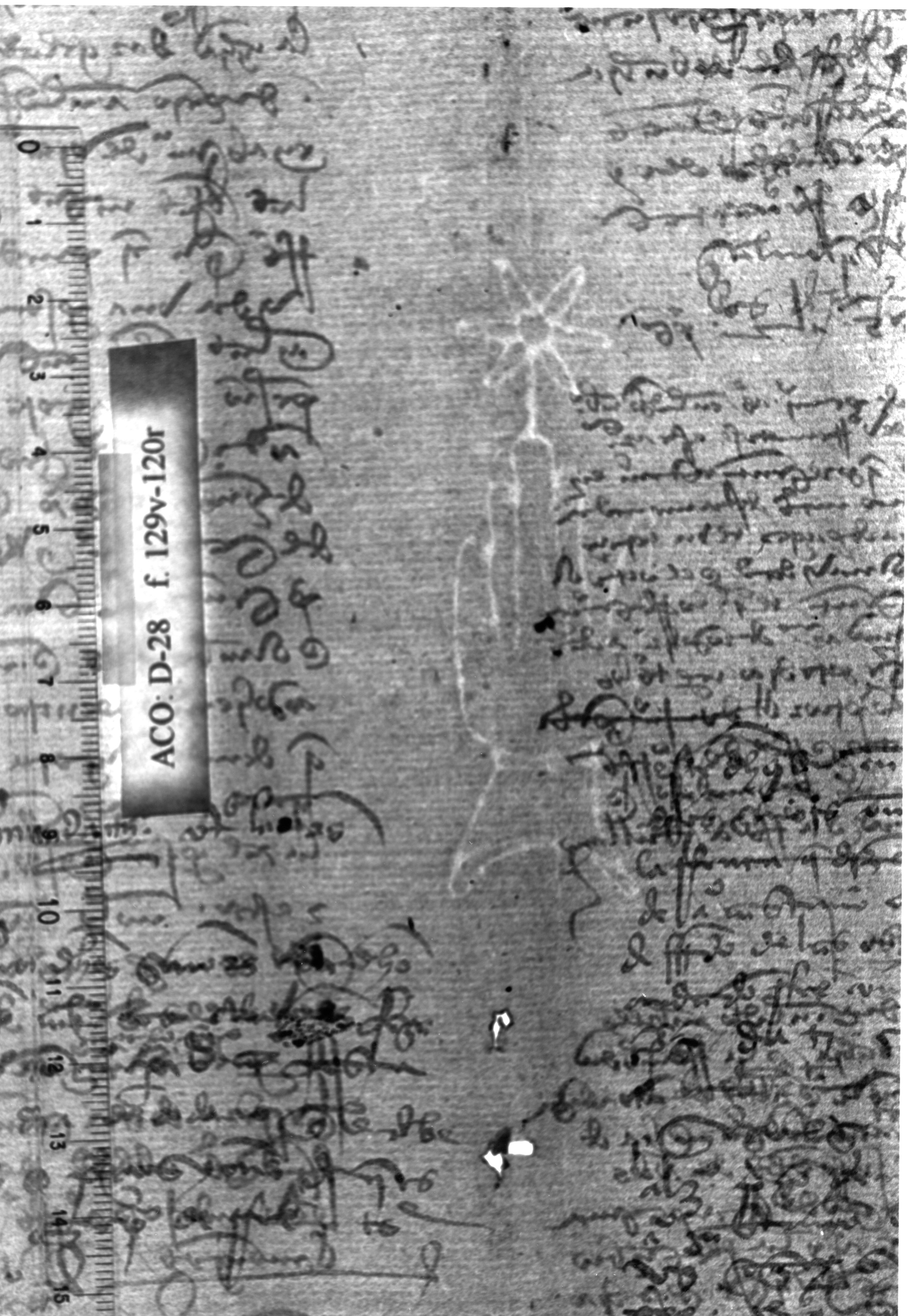 Signatura: D-28 Nº de folio o página: 129v-120r País de uso del papel: España Lugar de uso del papel: Oviedo, Asturias. Fecha de uso del papel (año): [1/2 s.XV] Última fecha de uso del papel (año): [1/4 s. XV] Modo de datación: Sin fecha, ni posibilidad de estimarla Título/Resumen: Libro de Acuerdos Capitulares de la Catedral de Oviedo. | |