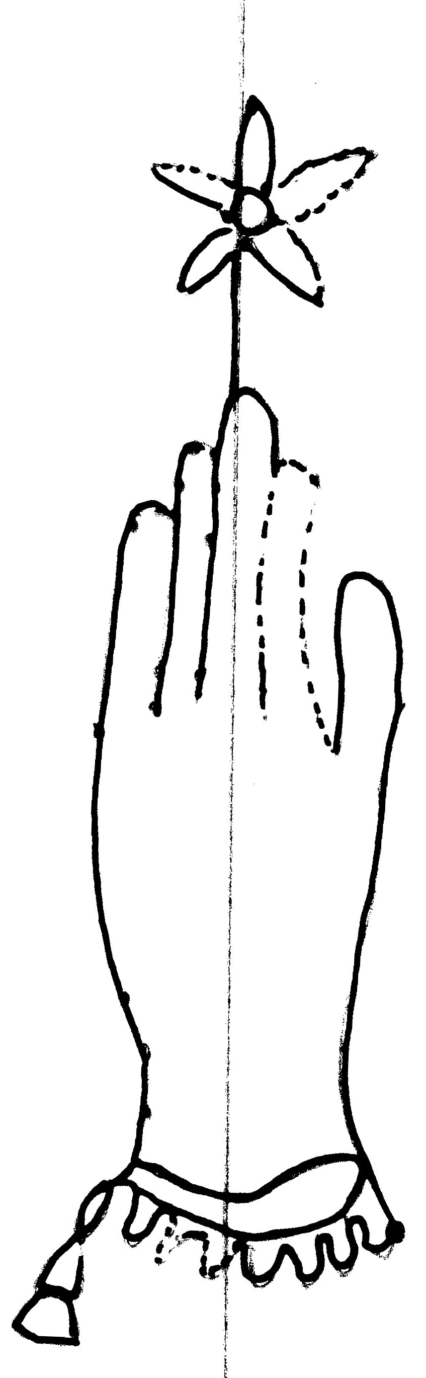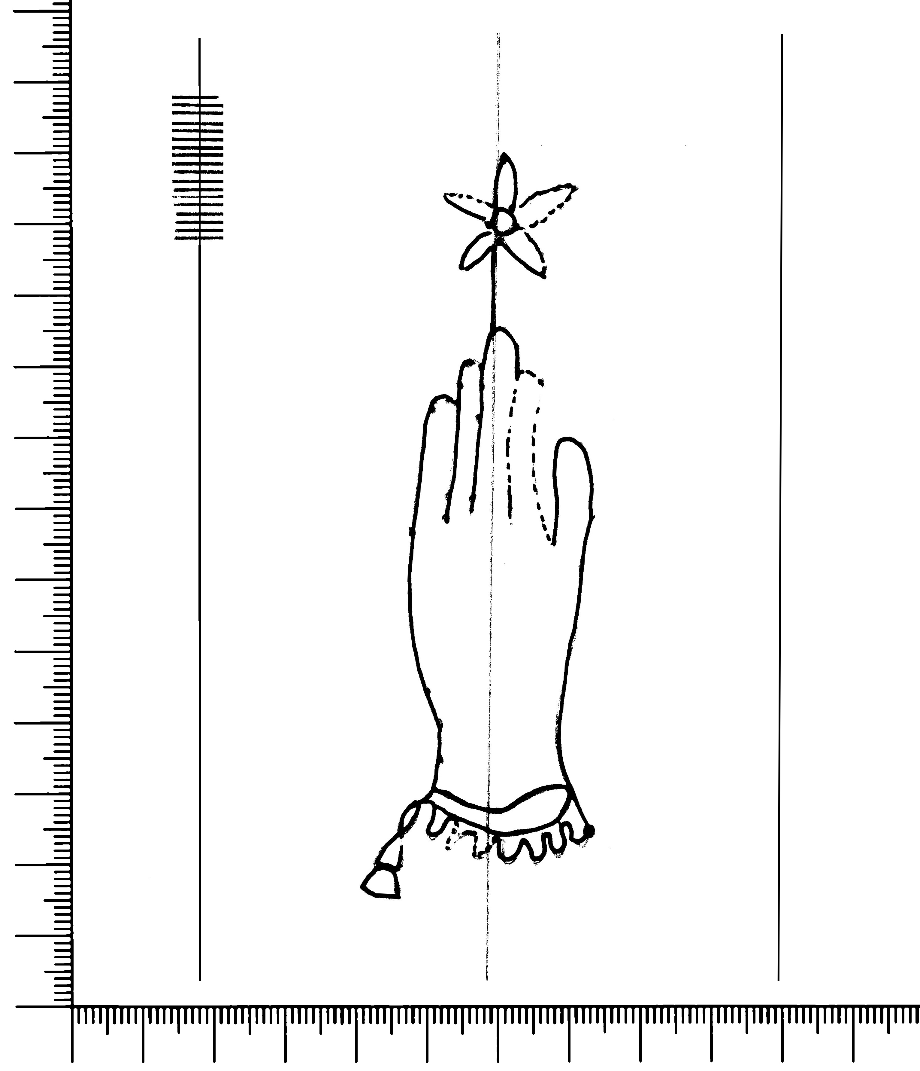 Tipo de filigrana: Sencilla Parte estudiada: Toda la filigrana Código del Motivo: B.02.07.02 Descripción: Mano con cuatro dedos juntos y pulgar separado. Con puño festoneado y encima flor de seis puntas Estructura: Tradicional de líneas Altura (mm): 106 Anchura (mm): 33 Tipo de papel: Verjurado Posición en la hoja: Derecha centro Nº de corondeles en la hoja: 5 Distancia entre corondeles: Situada entre el corondel 3 y el corondel 5 Posición en relación al texto: Perpendicular al texto hacia abajo Origen de los datos: Datos obtenidos del original Información adicional: Son visibles las puntadas que unen la filigrana a la verjura. Autor de los datos de este registro: María Dolores Díaz de Miranda Macías y Ana María Herrero Estado de la hoja: Cortado borde derecho Altura de la hoja: 311 Anchura de la hoja: 222 Color de la hoja: Natural Estado de conservación: Bueno pH del papel: 7,52 Institución: Archivo de la Catedral de Oviedo.