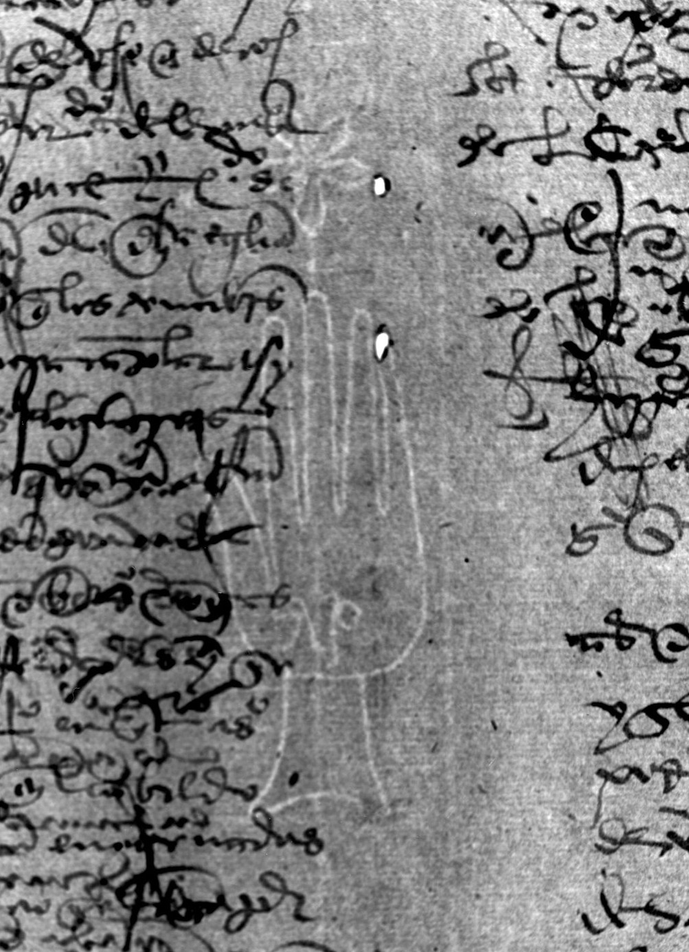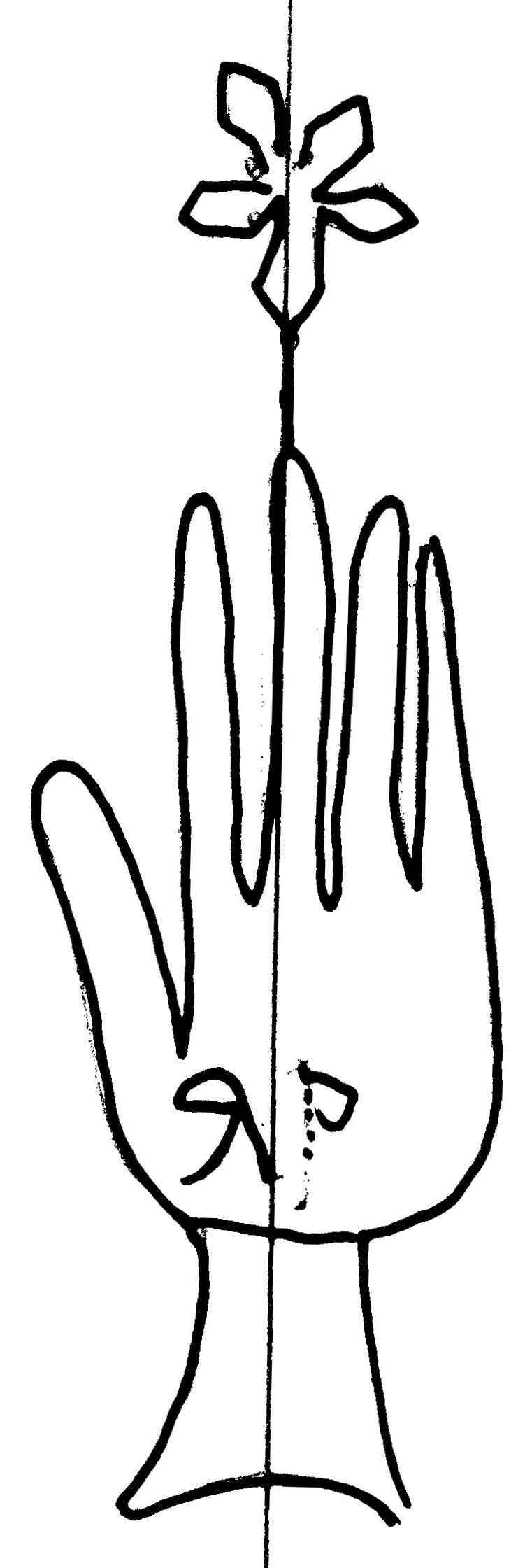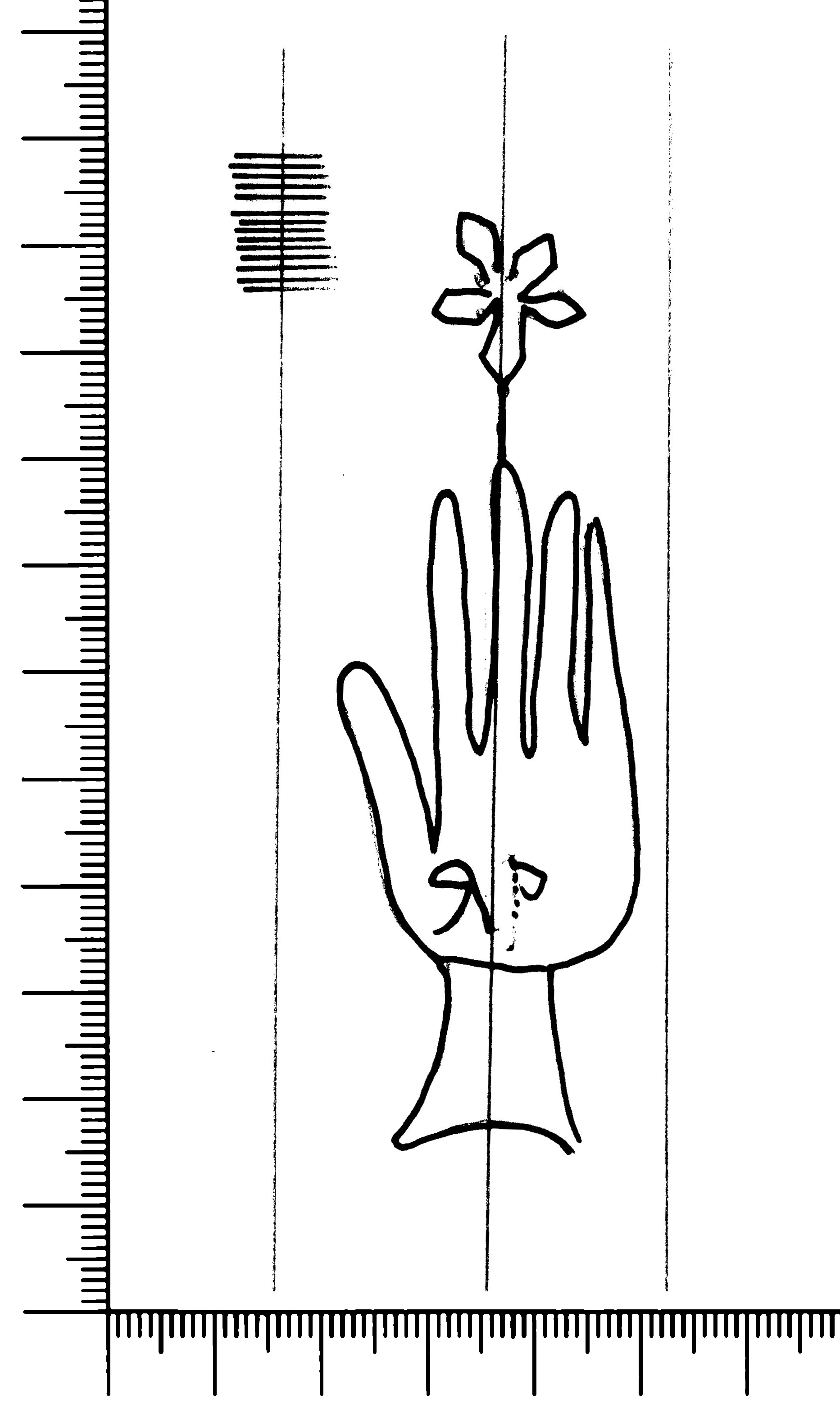 Tipo de filigrana: Sencilla Parte estudiada: Toda la filigrana Código del Motivo: B.01.07.00 Descripción: Mano con los dedos abiertos. Emcima flor de seis puntas y dentro letras Estructura: Tradicional de líneas Altura (mm): 88 Anchura (mm): 30 Tipo de papel: Verjurado Posición en la hoja: Medio centro Nº de corondeles en la hoja: 7 Distancia entre corondeles: Situada entre el corondel 3 y el corondel 5 Posición en relación al texto: Perpendicular al texto hacia arriba Origen de los datos: Datos obtenidos del original Información adicional: Son visibles las puntadas que unen la filigrana a la verjura. Se ven muy mal los corondeles. No parece que tiene corondel de apoyo. Autor de los datos de este registro: María Dolores Díaz de Miranda Macías y Ana María Herrero Estado de la hoja: Cortado borde izquierdo Altura de la hoja: 313 Anchura de la hoja: 217 Color de la hoja: Natural Estado de conservación: Bueno pH del papel: 8,22 (oscila) Institución: Archivo de la Catedral de Oviedo.